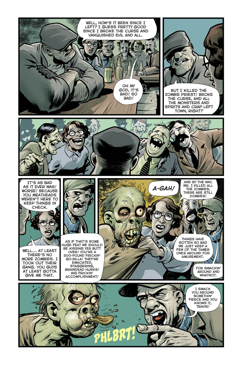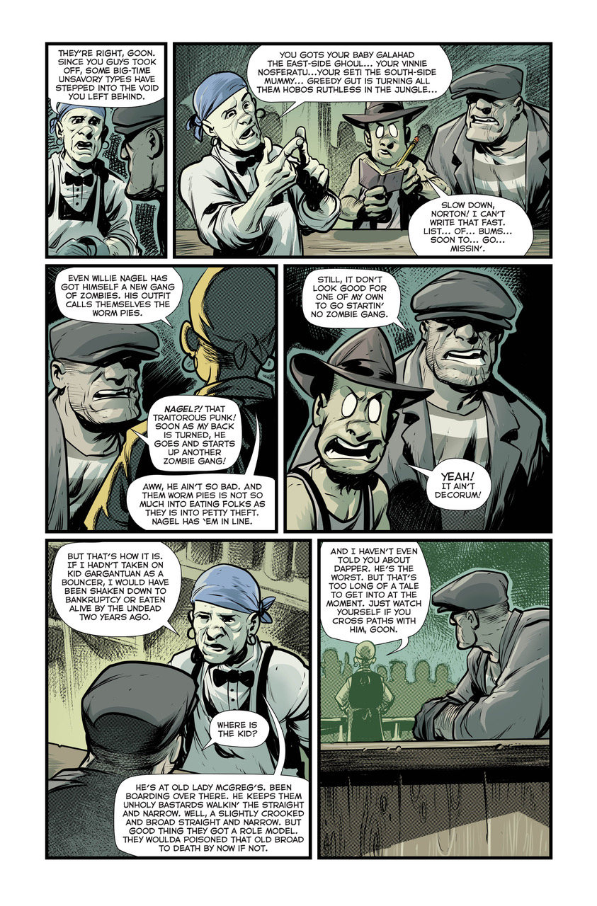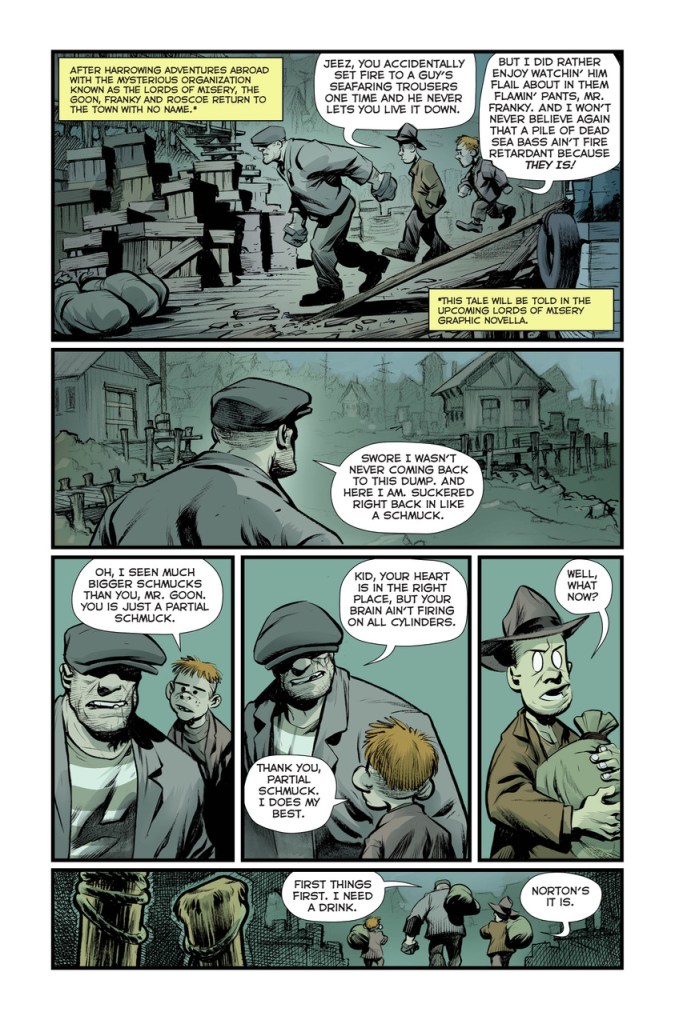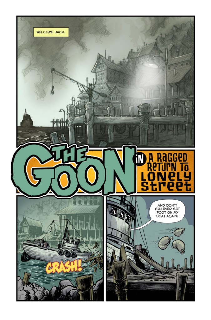 On a silent, foggy morning, a solitary fishing boat lurches and crashes into a deserted, decaying dock front. An angry voice shatters the silence and once more The Goon, Franky and Roscoe are back in The Town With No Name. Years after The Goon finally vanquished The Voodoo Priest and rid Lonely street of the Evil and monsters that dwelt there, the gang are expecting a hero’s welcome at Norton’s but they soon discover that things are as bad, if not worse, than ever before, and that Evil never dies.