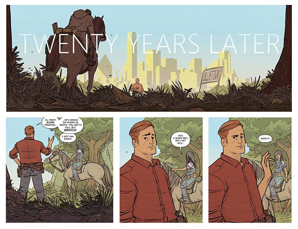 It’s twenty years in the future. Twenty years after some event has caused all the world’s adults to die, leaving the children – now grown up and with families of their own – to rebuild. There’s no petroleum (therefore no Mad Max shenanigans), no phones, no internet. Tech is essentially a distant memory and all that’s left are small communities trying to survive as best they can with horses and caravans. It’s a post-apocalyptic wild west comic which seems to pull together threads from Jeremiah to the Postman. And whilst I can’t rate the premise as overly original, it in no way detracts from the enjoyment I had reading this.