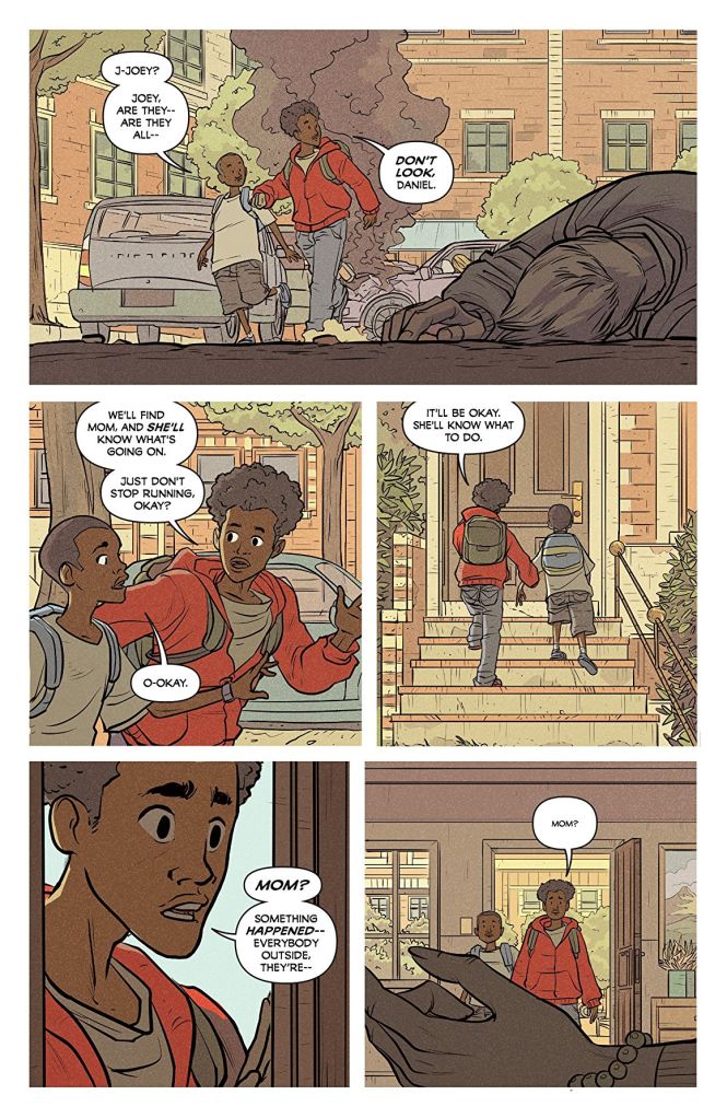 Every good story needs a beginning and, to paraphrase Princess Irulan, the beginning is a delicate thing. Writer Ted Anderson somehow manages to give the reader enough information in the first page to deliver the setting wholesale. We see two kids in the aftermath of the event, rushing home to tell their mother that something very bad has happened. Artist Nuno Plati captures the horror and immediacy of the situation by not labouring the point. We see damaged and smoking cars, no doubt the result of a crash, and a body on its side in the street.