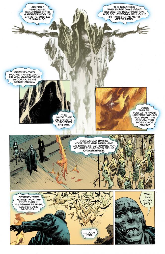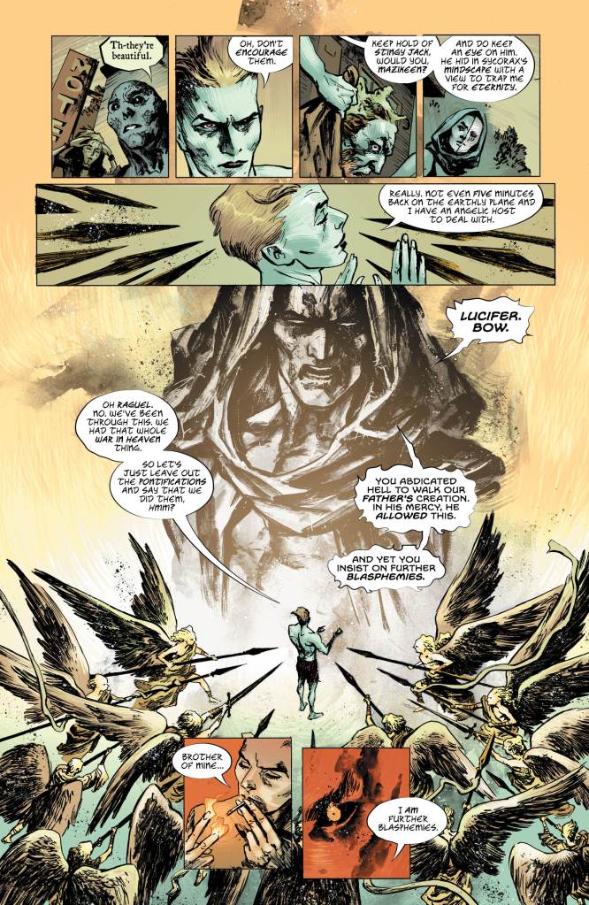 Dan Watters’ story doesn’t falter in the slightest as he takes us into this brand new arc, picking up exactly where the last one ended and managing to maintain the same exciting pace. Watters clearly took his time bringing us to this point so that we can really appreciate the character of Lucifer, only giving us only brief glimpses in flashback of his true sly devilish charm.