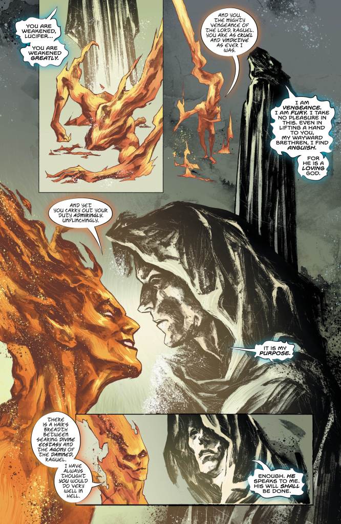 There is still conflict here, though. Lucifer is clearly not back to full strength, and finds himself more alone than he ever was. Not only that, but another side story emerges in the form of the cherub sent to disrupt our antihero’s machinations, which has the potential to be as interesting as the story of Detective Decker was as it snakes its way into the main plot.