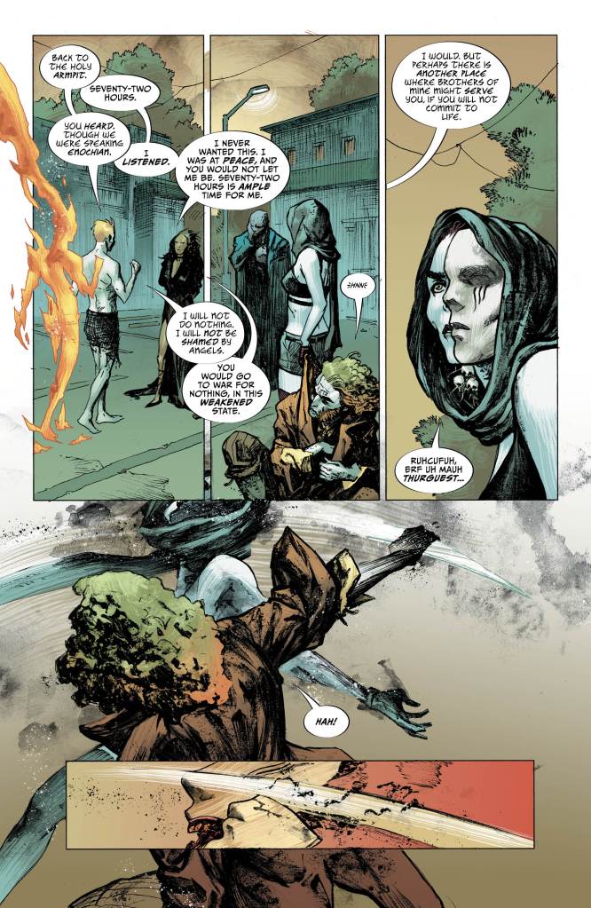 As a fan of the macabre, I also need to highlight the beauty of good research when it comes to the writing. I’ve said before how Watters and the Fiumaras have brought back to life the paintings and writing of William Blake and Shakespeare in this tale, but the mention of Enochian language and the character of the Angel of Justice Raquel (not just named but written in a storyline which lines up with with their original inception) provide masterful additions to a world already steeped in folklore and biblical mythology.