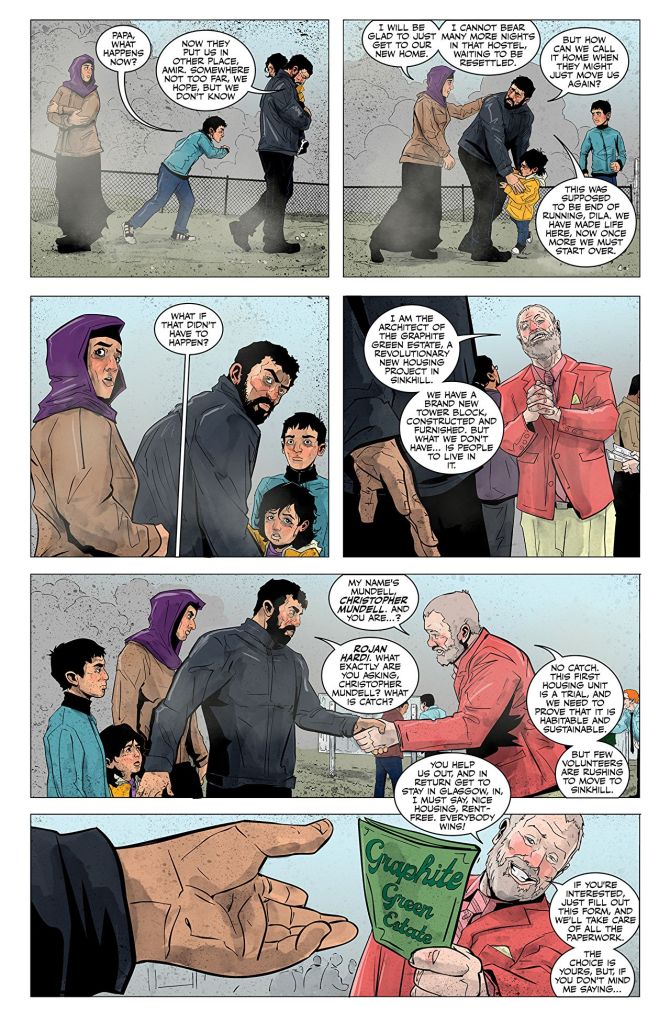 The latest issue of ComixTribe’s SINK introduces us to Kurdish immigrant Rojan Hardi and his family, who find themselves getting the rough end of the social housing system when the flats they were living in are demolished. However, fate is smiling on them (…right?) when a friendly stranger offers them a fantastic opportunity to live, rent-free, in Graphite Green, a new block of flats set up to provide assistance and shelter for the less privileged.