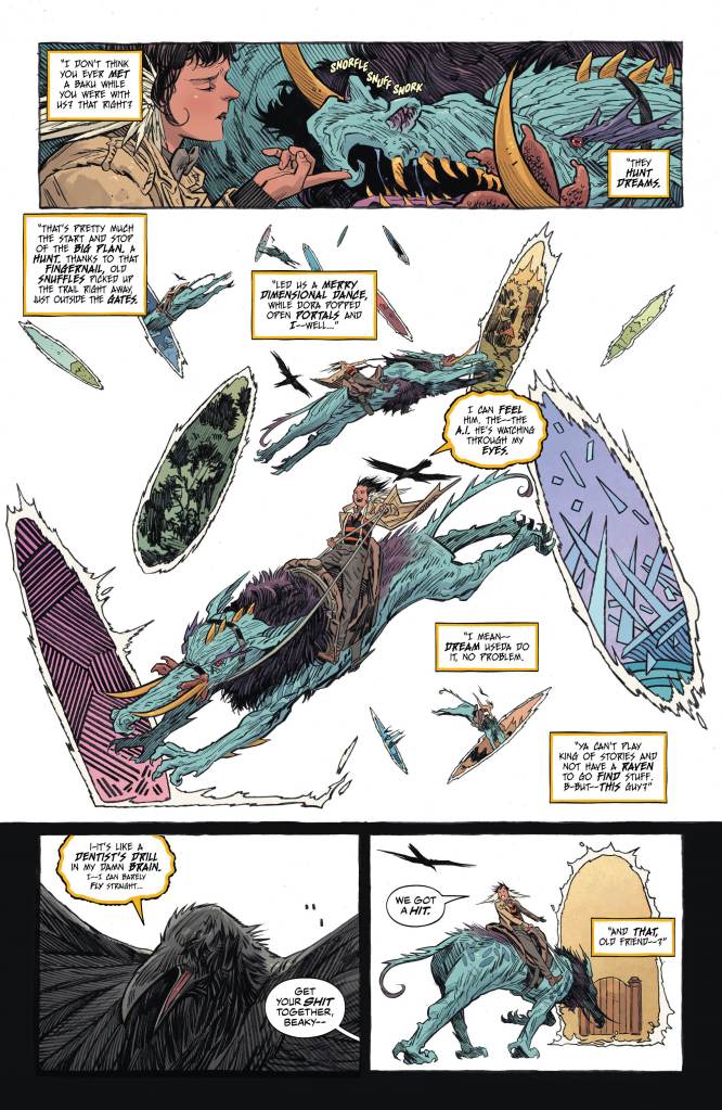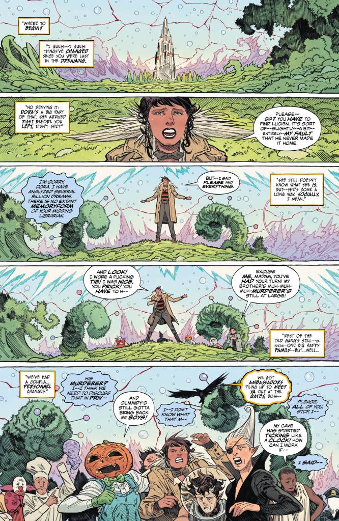 Told from the perspective of Mathew The Raven as he shares the events with another familiar face from Sandman past, we see how the new Dreamlord proxy has sent him (and the enigma that is Dora) in search of Daniel. A journey that takes them to the Sidhe Summer Court of Fairies, tracing the path of their seemingly damaged master. And while his wit isn’t as damaged as first thought, the rabbit hole will take them even further down, to more dangerous depths than they could have ever imagined.