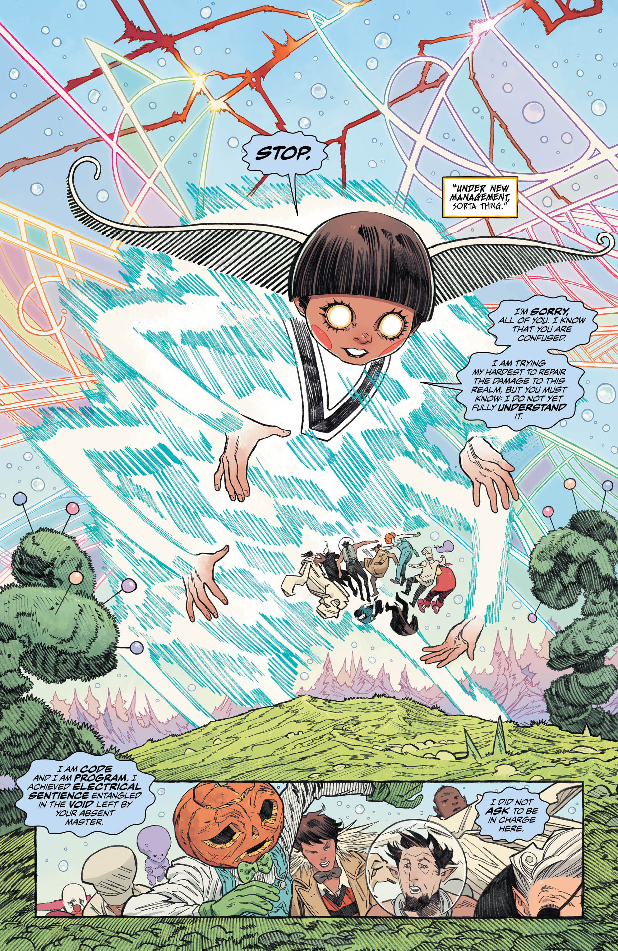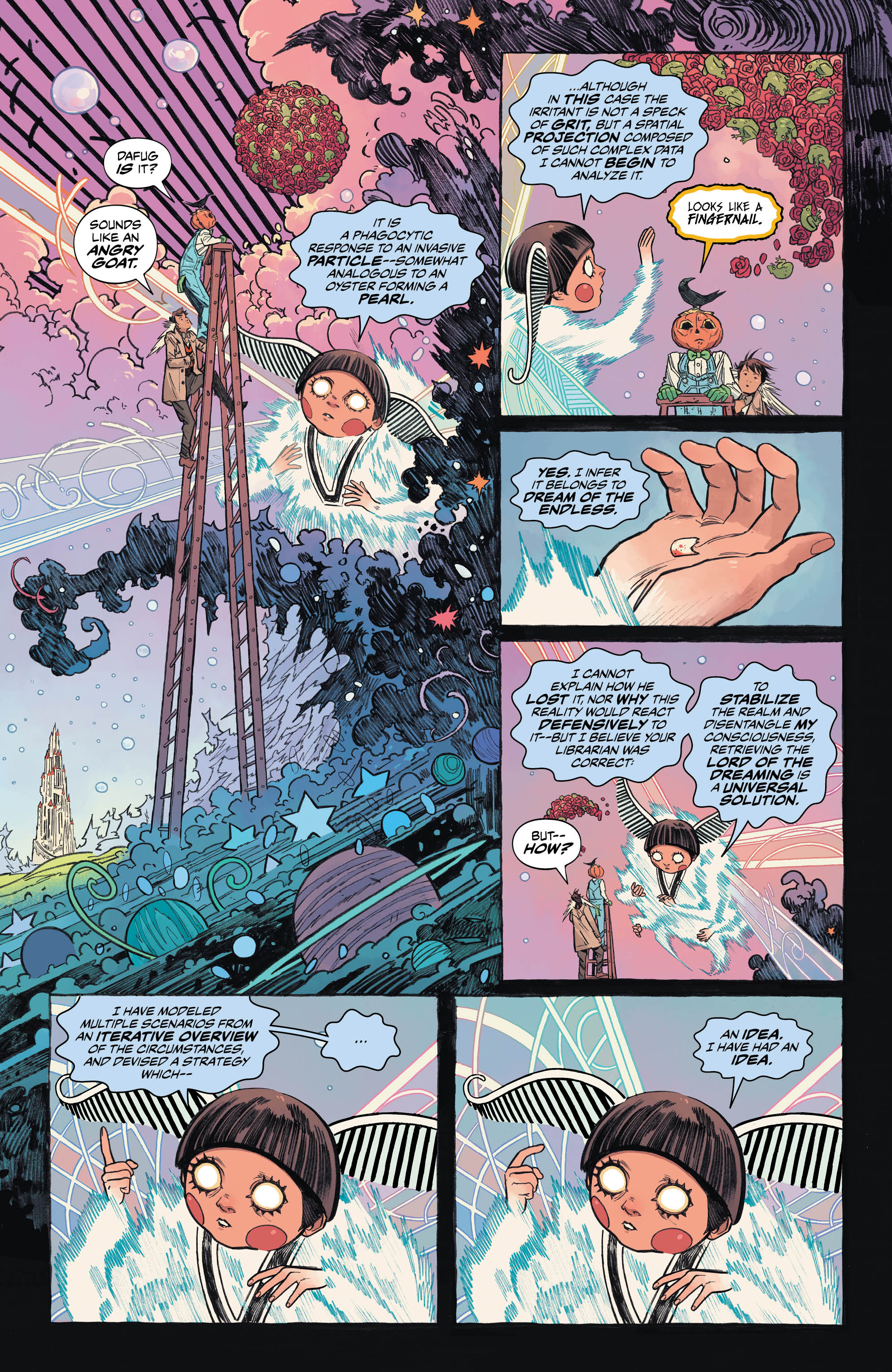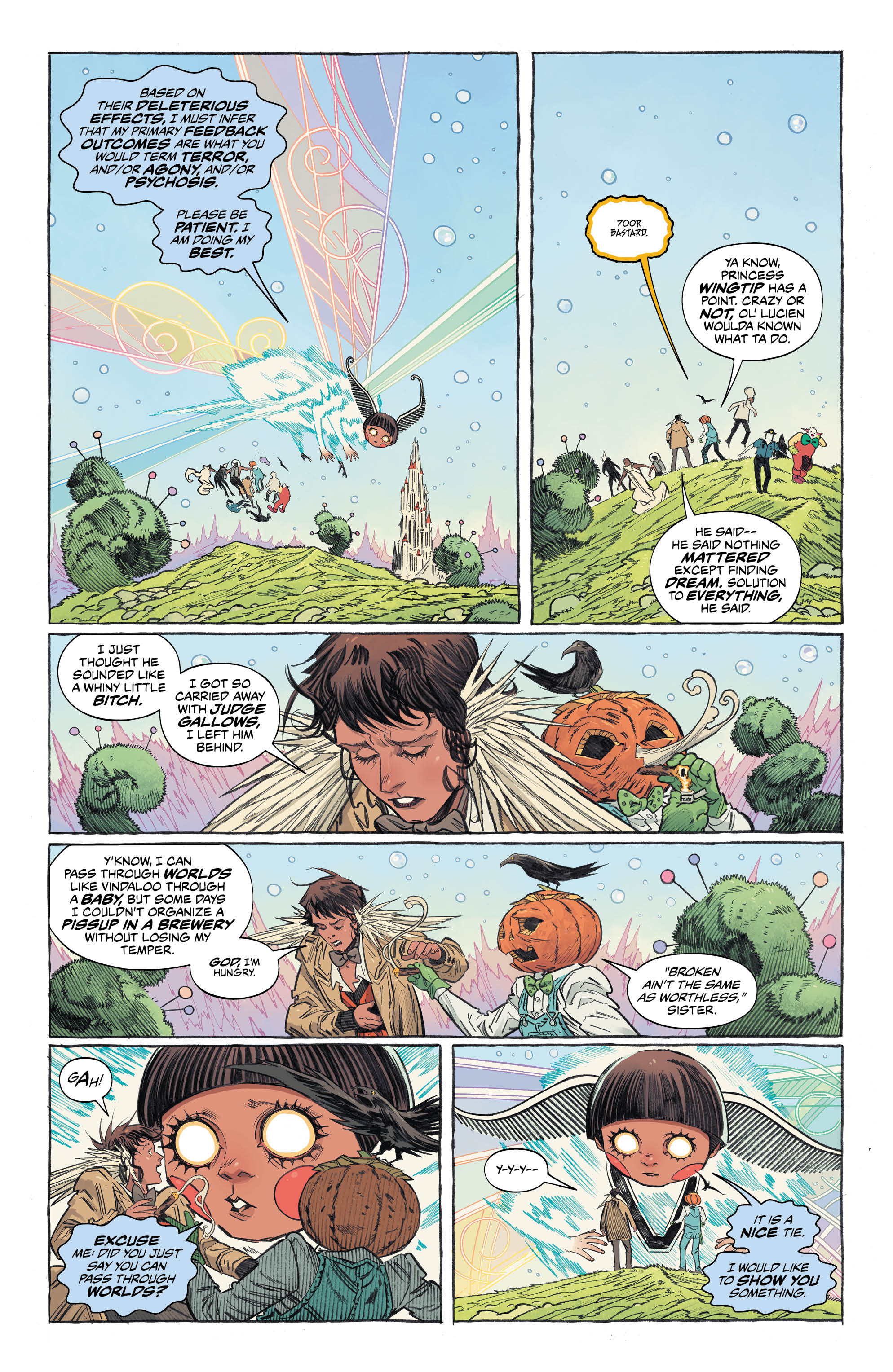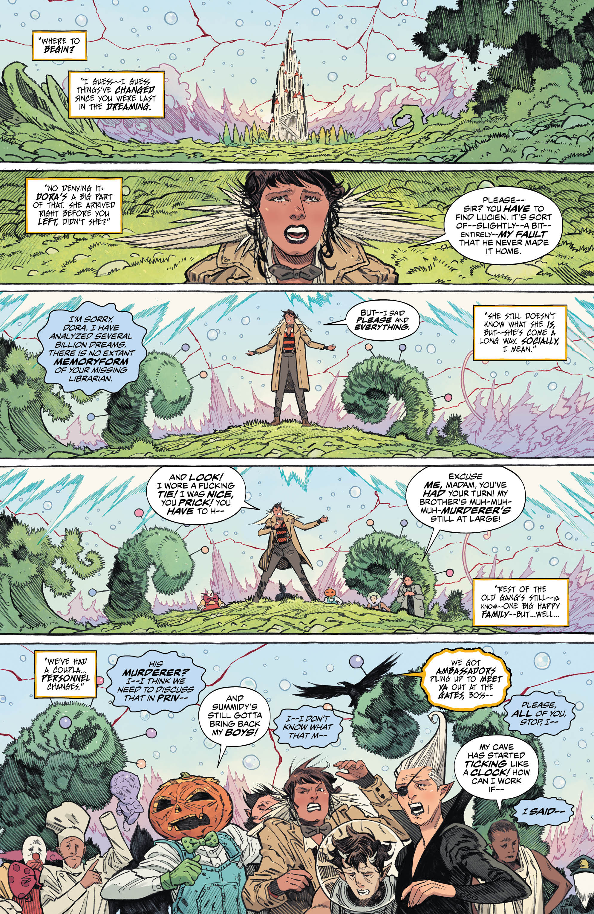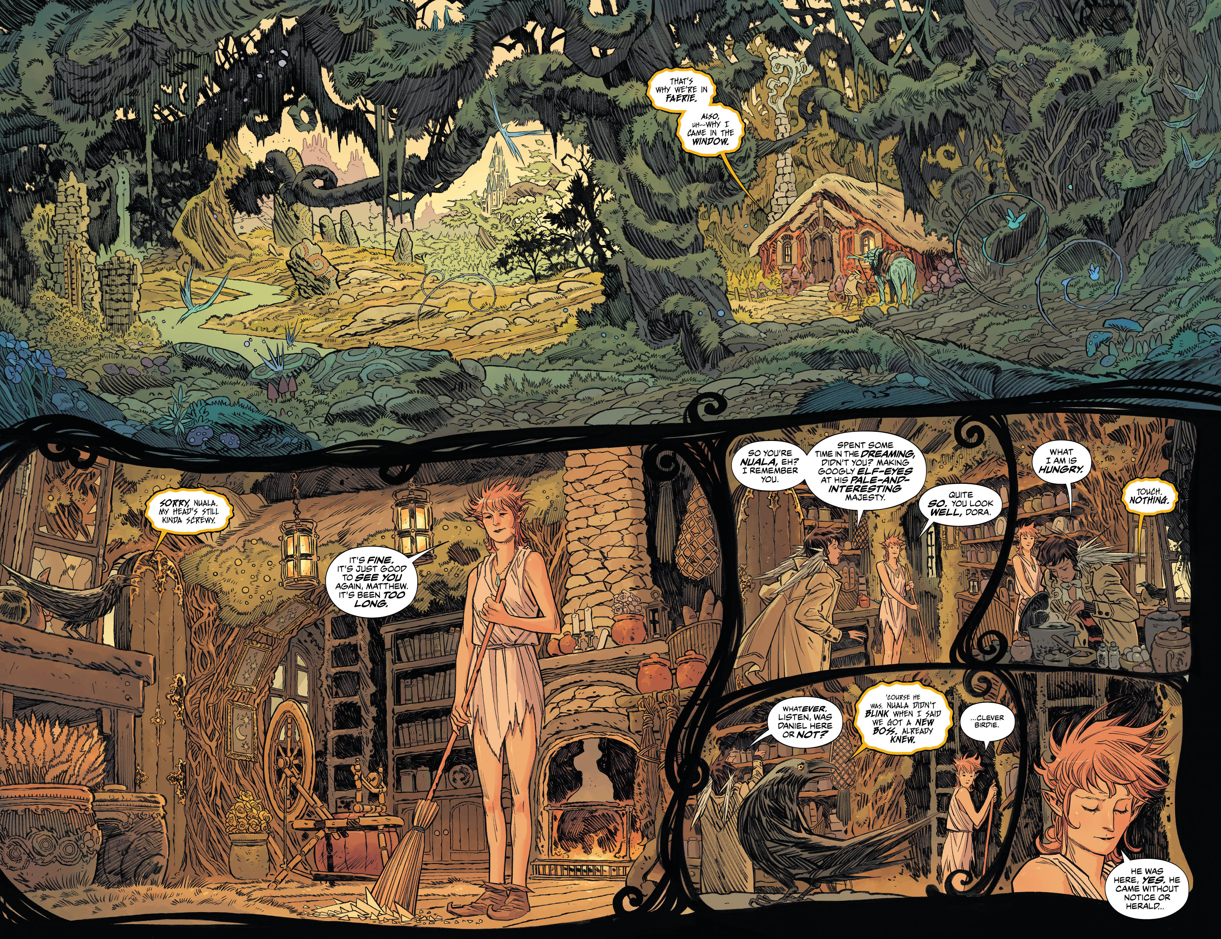 Told from the perspective of Mathew The Raven as he shares the events with another familiar face from Sandman past, we see how the new Dreamlord proxy has sent him (and the enigma that is Dora) in search of Daniel. A journey that takes them to the Sidhe Summer Court of Fairies, tracing the path of their seemingly damaged master. And while his wit isn’t as damaged as first thought, the rabbit hole will take them even further down, to more dangerous depths than they could have ever imagined.
