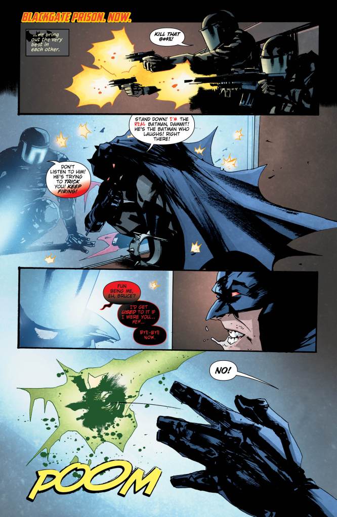 In my opinion, the writing here is absolutely perfect. Snyder manages to walk the line between action and plot progression in every panel, and even the lettering plays a part in showing us just how close to the edge Batman is skirting in order to try and stop his dark counterpart. The main reason I think The Batman Who Laughs works so well is because he exemplifies the side to Batman that we all choose to ignore, the fact that he is in many ways just as bad as the villains he fights against. He’s just as single minded in his approach to his mission, and just as maniacal and borderline sociopathic in his planning. And like Alan Moore once said, all it takes is one bad day.
