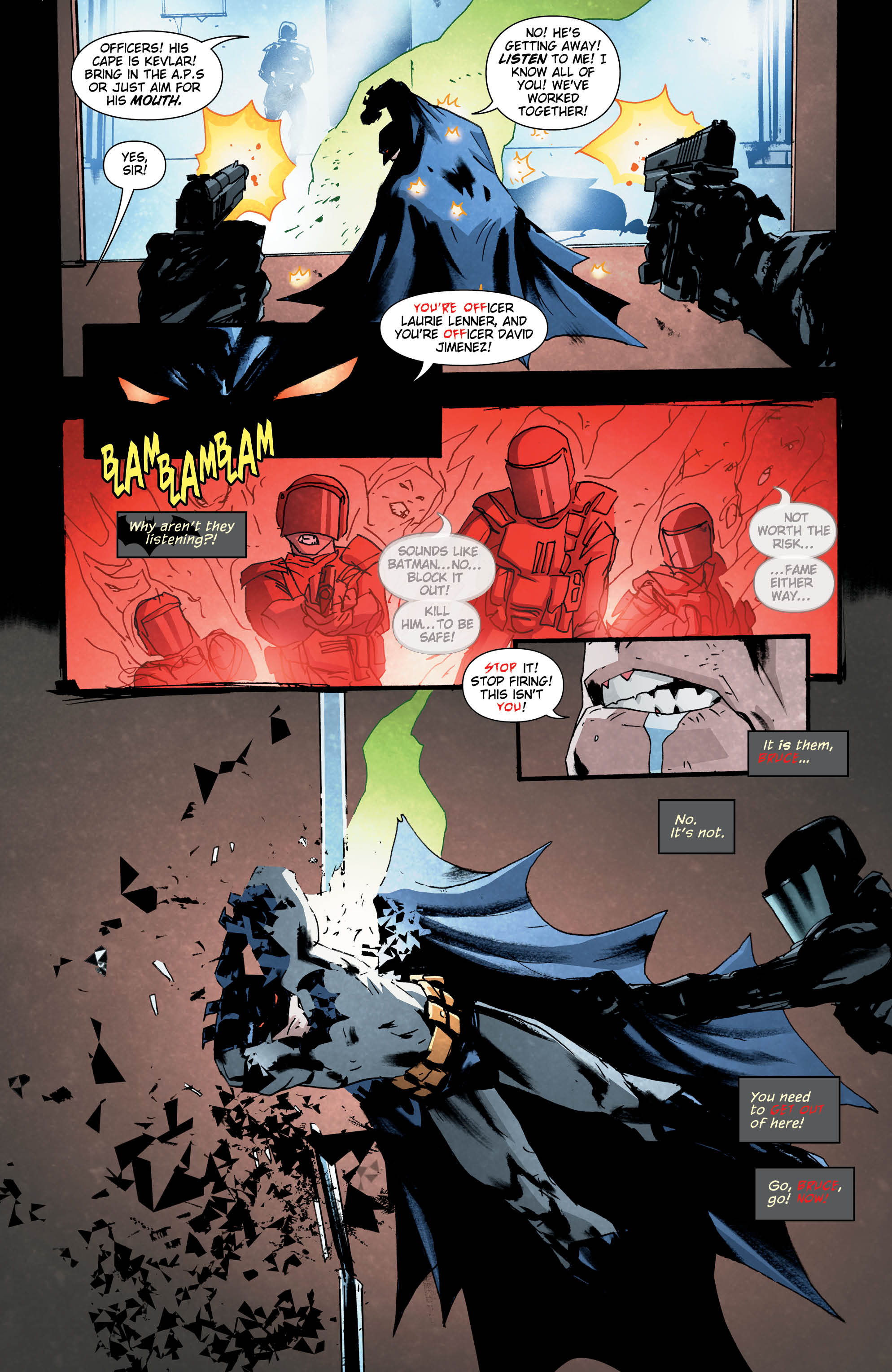 Jock adds a real sense of dramatic horror to these issues. His jagged representation of the characters continues to haunt my dreams, as does his unsettling choice of angles. When it comes to the Batman Who Laughs, Jock purposely chooses to highlight one of the most off-putting things about him. Namely, his lack of eyes. In the close-ups, he focuses on the blood red grin jumping out at you against a stark black background. It’s techniques like this and the mirroring of Bruce’s red eyes as he goes off the deep end that really give me the willies.
