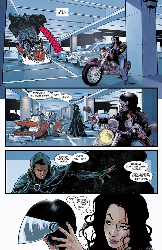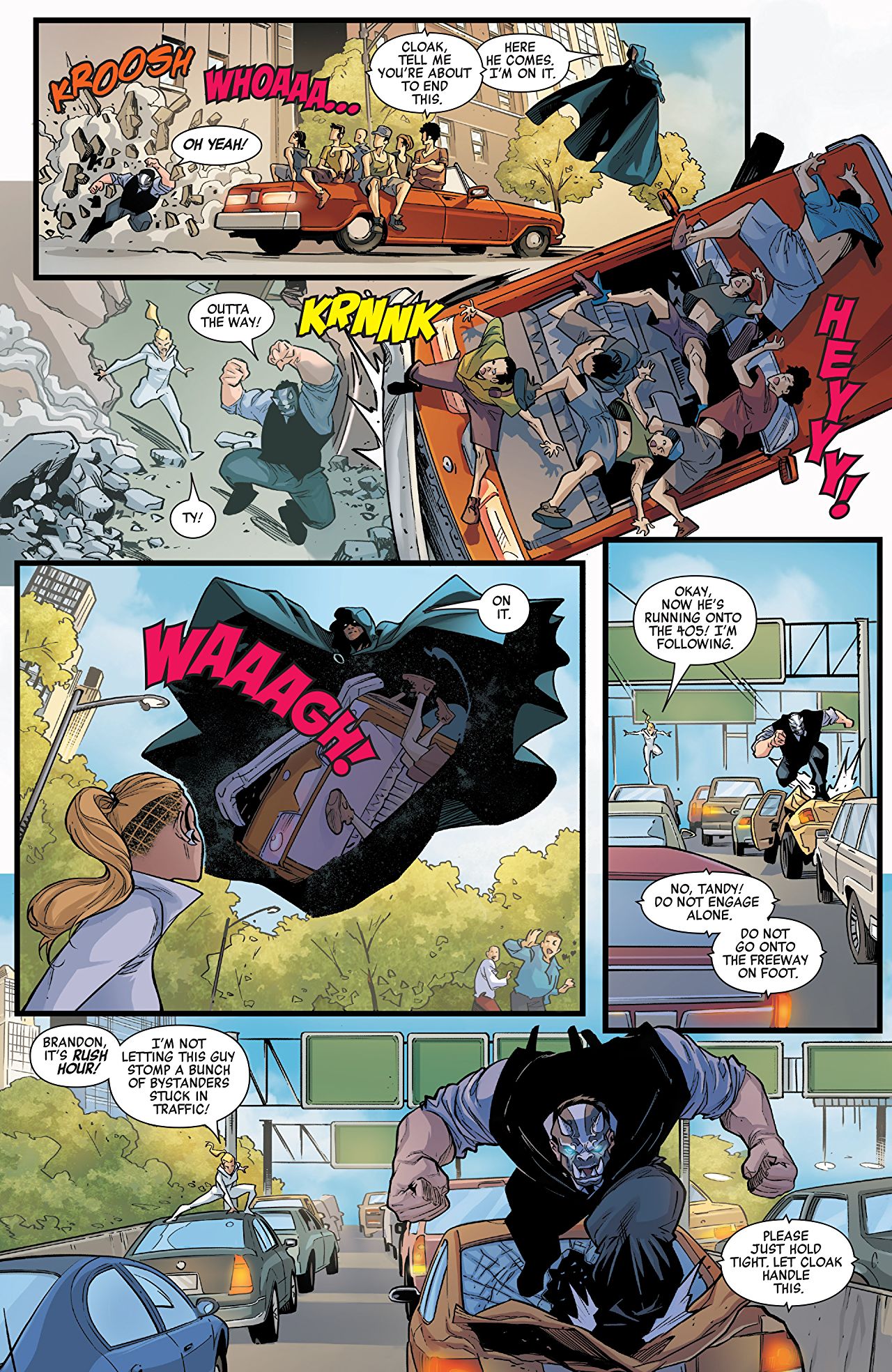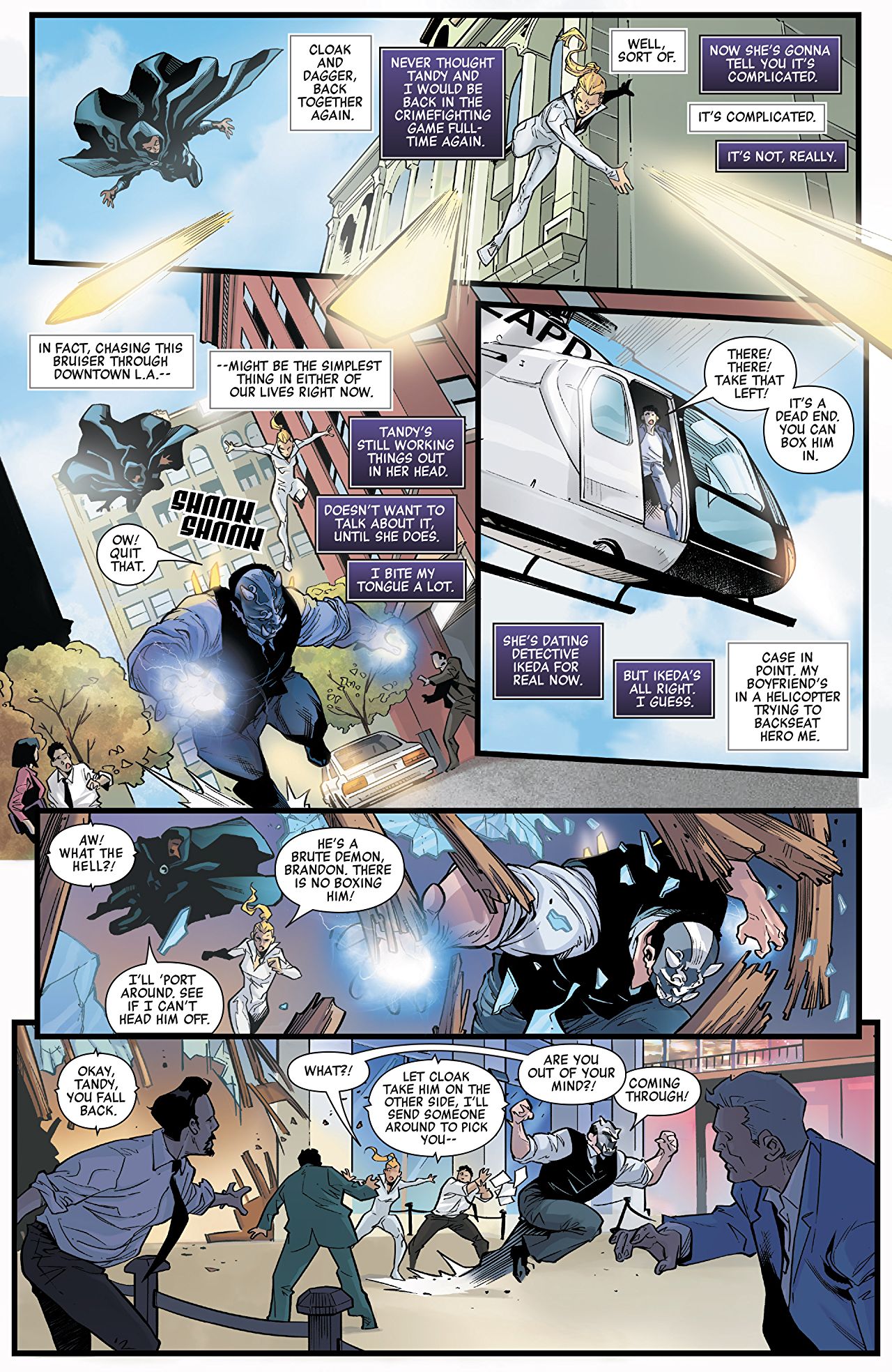 Writer Dennis Hopeless quickly brings us up to speed about the new, tense dynamic between our superhero duo as they struggle to apprehend one of Mister Negative’s hulking goons. Tandy is seeing Detective Ikeda (who is also overseeing Cloak & Dagger’s activities as part of the L.A.P.D.), while Tyrone is in the formative stages of a new relationship with sassy adrenaline junkie Vivian, and tensions are running high as the pair try to move on with their personal lives while still functioning as a team in their professional ones.