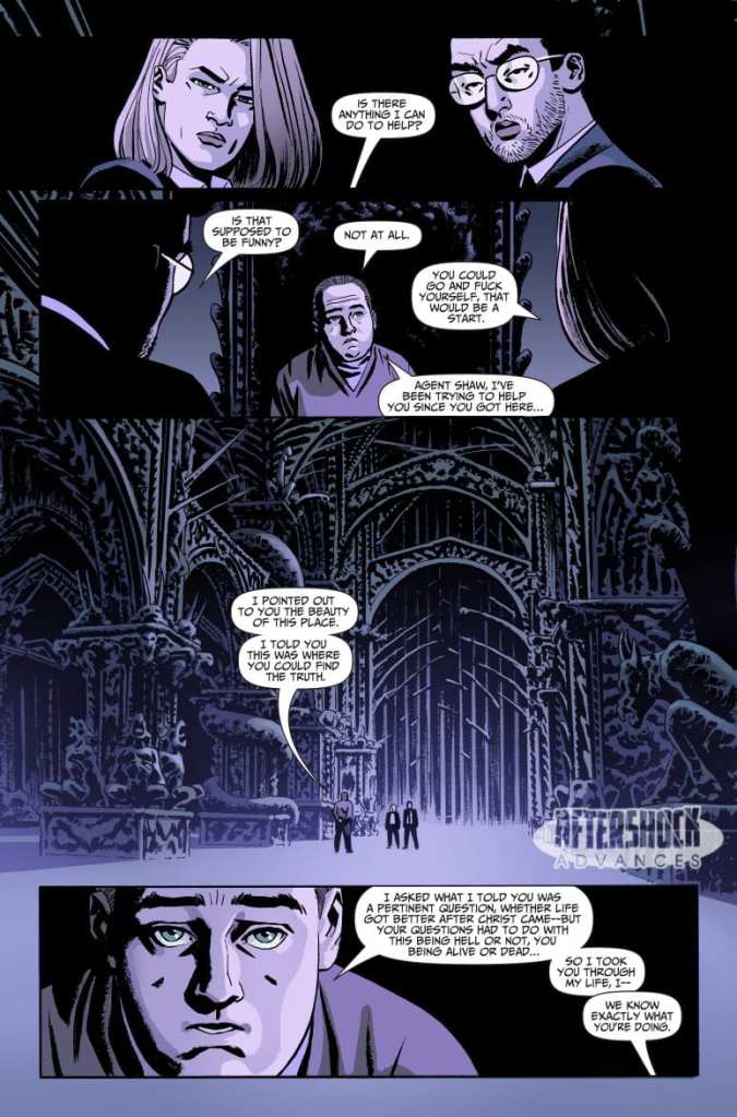 Shaw and McGregor continue to wander the shadowy vaulted halls of Notre Dame, unwillingly guided by Carnahan, looking for answers and an escape from their nightmare, when a figure from McGregor’s past appears to torment and horrify the pair.