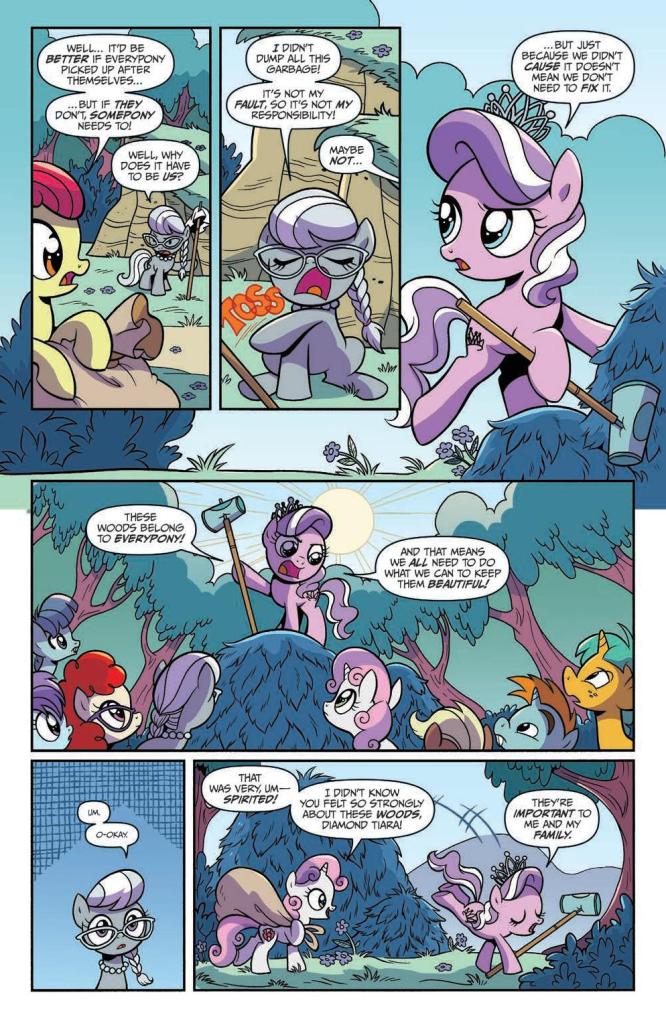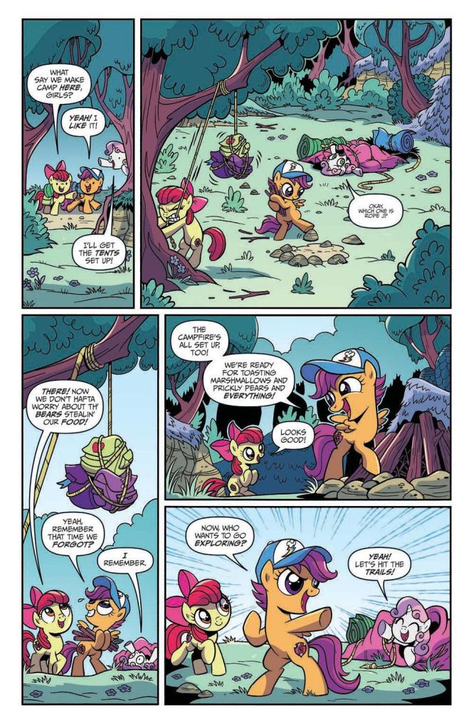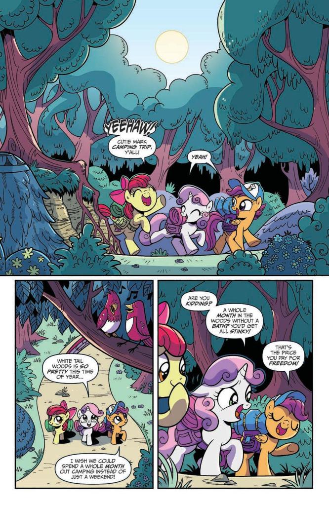 The premise is pretty simple and easy to follow; the CMCs are out camping in White Tail Woods, and discover that someone is being less than conscientious with their litter. Despite organising a clean-up with others from Ponyville, the litter returns and it turns out there’s more going on in Woods than first meets the eye. On top of the mundane events in the forest, there’s also the legend of the Spirit itself and maybe how it’s a tad more than legend…