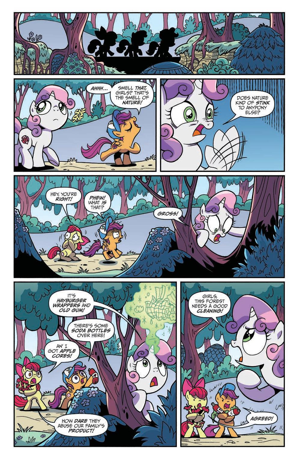 “The Cutie Mark Crusaders are back! When Apple Bloom, Scootaloo, and Sweetie Belle take a trip into the woods, they find a forest filled with trash! Just what could be causing this mess?! Looks like it’s another mystery for our favourite fillies to solve—and one where not everything is as it seems…”