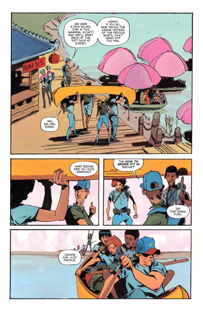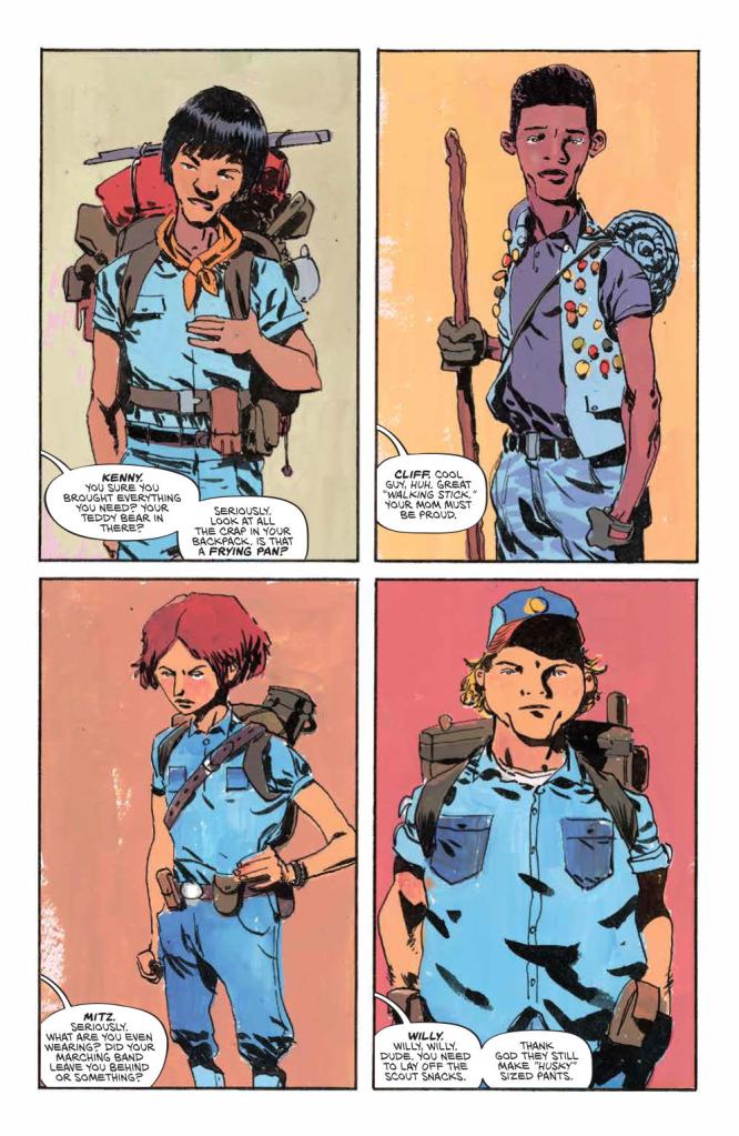The first issue introduces us to our four “Black Badges” as, under the disguise of youthful innocence, they venture into North Korea for a bit of tactical espionage. As you do. Nobody suspects a group of lost kids on a school trip, right? We have Kenny, the always-prepared leader of the ground; Mitz, the archery expert with the intriguing secret; Cliff, the brains and muscle of the group, who speaks softly and carries a (literal) big stick; and new recruit Willy, who has earned every badge available to the real boy scouts, but who is still a little wide-eyed and innocent about the whole international espionage thing.