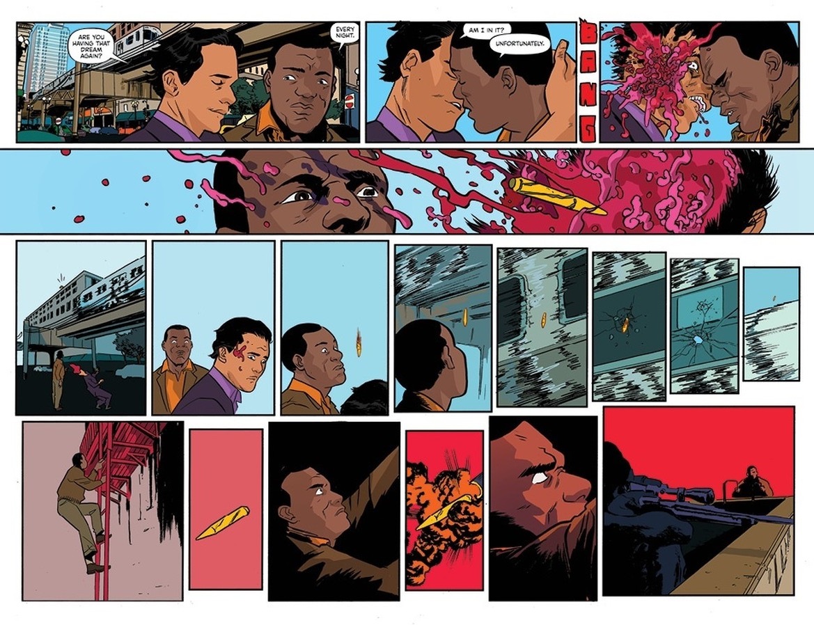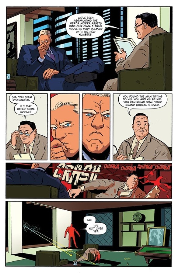 As has become a bit of a recurring theme in the series, Fuck Tarkington and Dave provide the bulk of the chuckles, with their interactions – not to mention one genuinely hilarious gag with an elevator – keeping things light even as the bodies continue to pile up. The final pages seemingly reveal the true identity of the assassin hired to take out Rankin, but I wouldn’t put another last-minute swerve past these creators at this point, so I’m not 100% convinced just yet. Oh, and we still need confirmation of whether it really was Fingerman who killed Bishop’s husband after all.