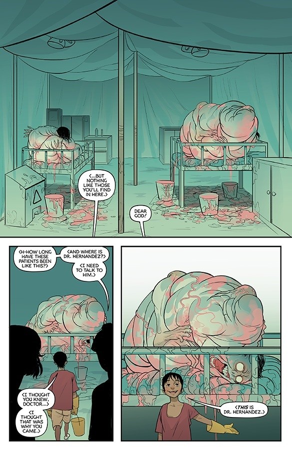 Cullen Bunn is one of those writers who seems to effortlessly turn out hit after hit, and this new collaboration with Kyle Strahm looks like it has the makings of another one. Right from the outset, this is a body shock horror story in the best traditions of Junji Ito with a truly disturbing premise. This isn’t a disease that simply kills. It unmakes you, warps you, and leaves you silently screaming your insanity through an idiot’s drooling grimace.