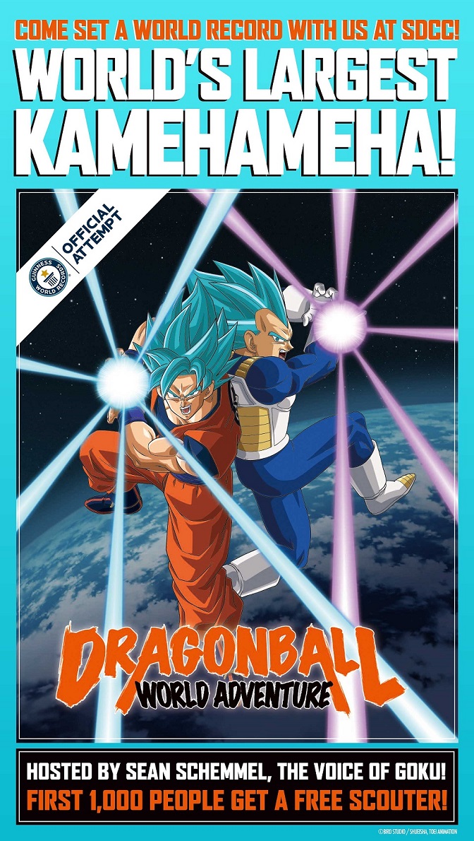 Fans will gather on Wednesday, July 17 at 3:30 p.m. at the 2019 Dragon Ball World Adventure on the Marriott Marina Terrace at the Marriot Marquis San Diego. The first 1,000 participants to arrive will receive a free Dragon Ball Scouter accessory to wear during the Guinness World Records attempt. The Kamehameha super energy attack move will be led by actor Sean Schemmel, the English voice of Dragon Ball character Goku. Guinness World Records will be onsite to supervise and validate the record attempt.