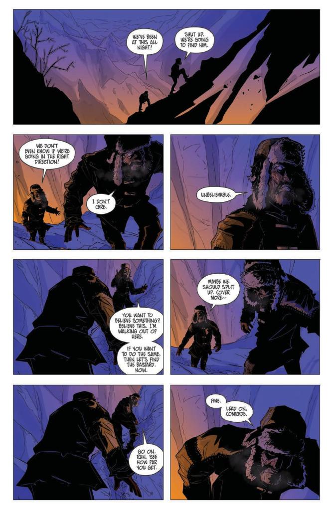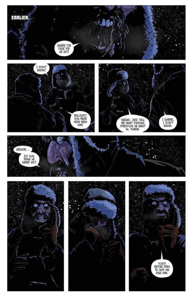At the end of last issue’s horrifying cliff-hanger we were left with a single chilling panel of Roman’s terrified face as Sergei and Grigori prepare to enact their grizzly plans. Issue three opens with an equally chilling scene, brought to life in one of Alex Cormack’s trademark blood-spattered pages, along with a massive question mark as to whose blood is soaking the page. The remainder of the issues shows us the events leading up to this page, a desperate, hopeless search for the fleeing Roman and a brutal, blood-soaked battle for survival. I’ll leave you to discover exactly whose survival when you pick up your own copy.