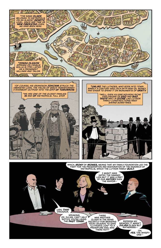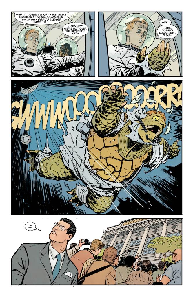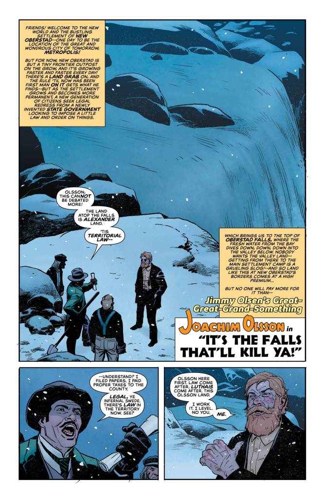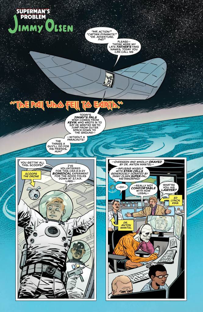 The pair adopt a fairly unconventional style of narrative that sees us starting with a brief history lesson of the significant role the Olsens (or Olssons) played in the birth and expansion of Metropolis, before leaping headlong (literally) into the action as a Jimmy attempts to jump from outer space and land on the ground without a parachute. Yeah, you heard me. Gotta keep those “Jimmy’s Pals” wish makers happy, right? The final pages also offer up some cracking possibilities as Jimmy finds himself temporarily relocated to a new-yet-familiar DC location, but with these two creators at the helm, I don’t think we could even begin to predict where this series is going.