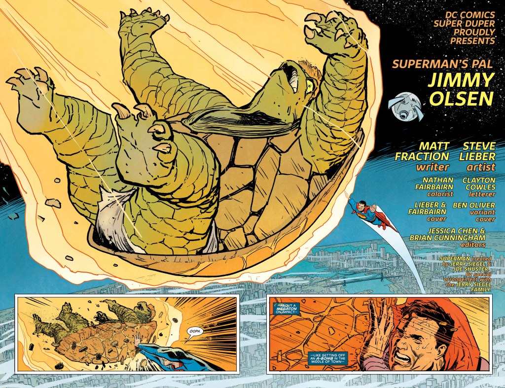 The idea of Matt Fraction and Steve Lieber, who have been responsible for what I personally consider two of the funniest and most entertaining comics of the last decade (Hawkeye and Superior Foes of Spider-Man, if you’re keeping score at home), collaborating on pretty much anything is more than enough to get me excited. So when I found out the pair were teaming up for a brand new series focusing on everyone’s favourite(ish) hapless superhero acquaintance Jimmy Olsen, I added it to my pull list quicker than you could say “super-duper!”