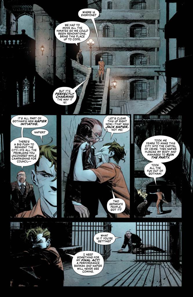 The first issue of this new series takes the story in a totally different direction, albeit one with loud echoes of the events of the first arc. After a flashback that will likely prove relevant as the issues go on, we meet a Joker we all recognize. A psychopathic genius who seems to be finally free of his sane counterpart Jack Napier. A Joker who finds himself filled with spite about the changes Napier has inspired in Gotham, changes which have undone all the work the Clown Prince of Crime put into reducing Gotham to a fear-addled cesspit.