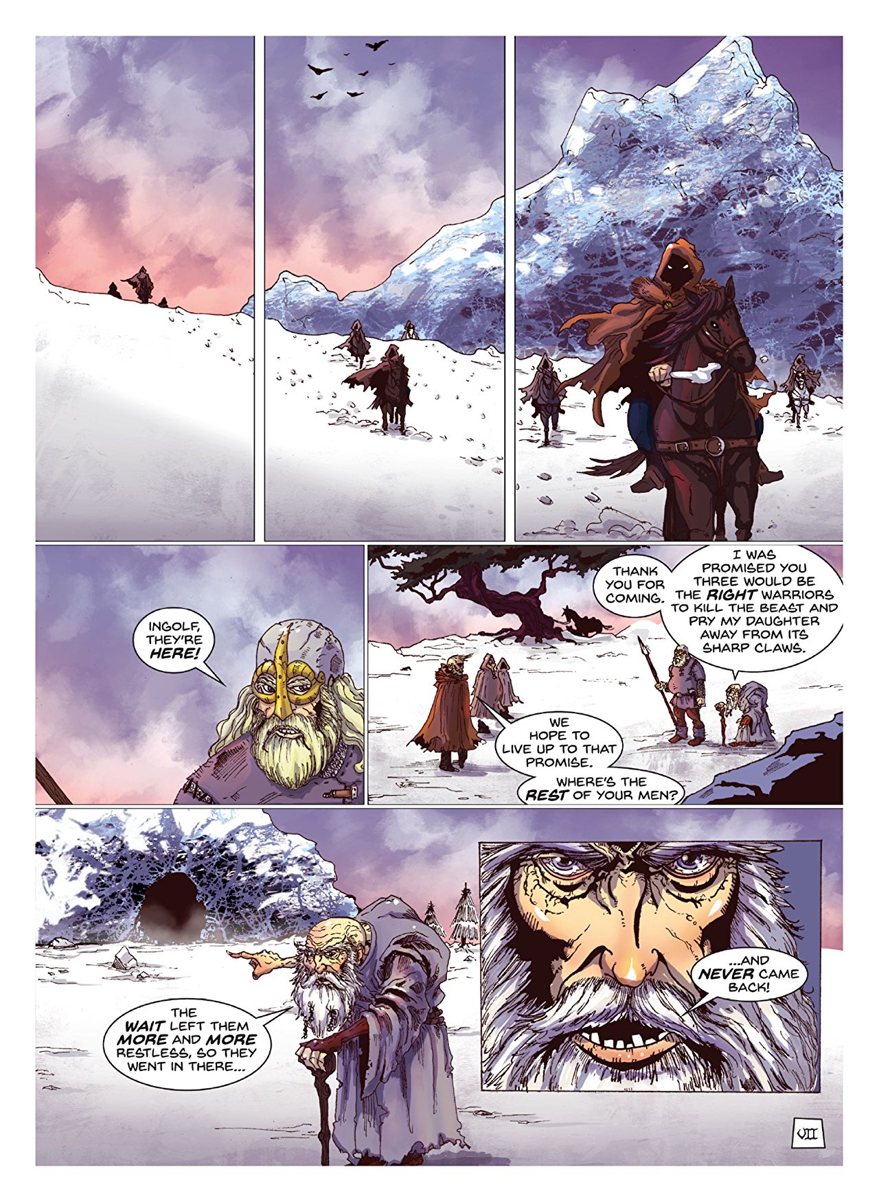 This first issue, “Of Wolf And Man” is, unsurprisingly, a story of werewolves and blood and a revenge which, for some, is very personal. A remote village sacrifices its daughters to the giant wolf Fenrir in order to keep marauding wolves from destroying all their sheep. However, when the elder’s daughter is chosen he seeks out a band of mercenaries to rescue her and kill Fenrir to free them of their curse. What none of them realise, however, is that it’s not just wolves that are terrorising them but a band of werewolves set on creating a new world order.