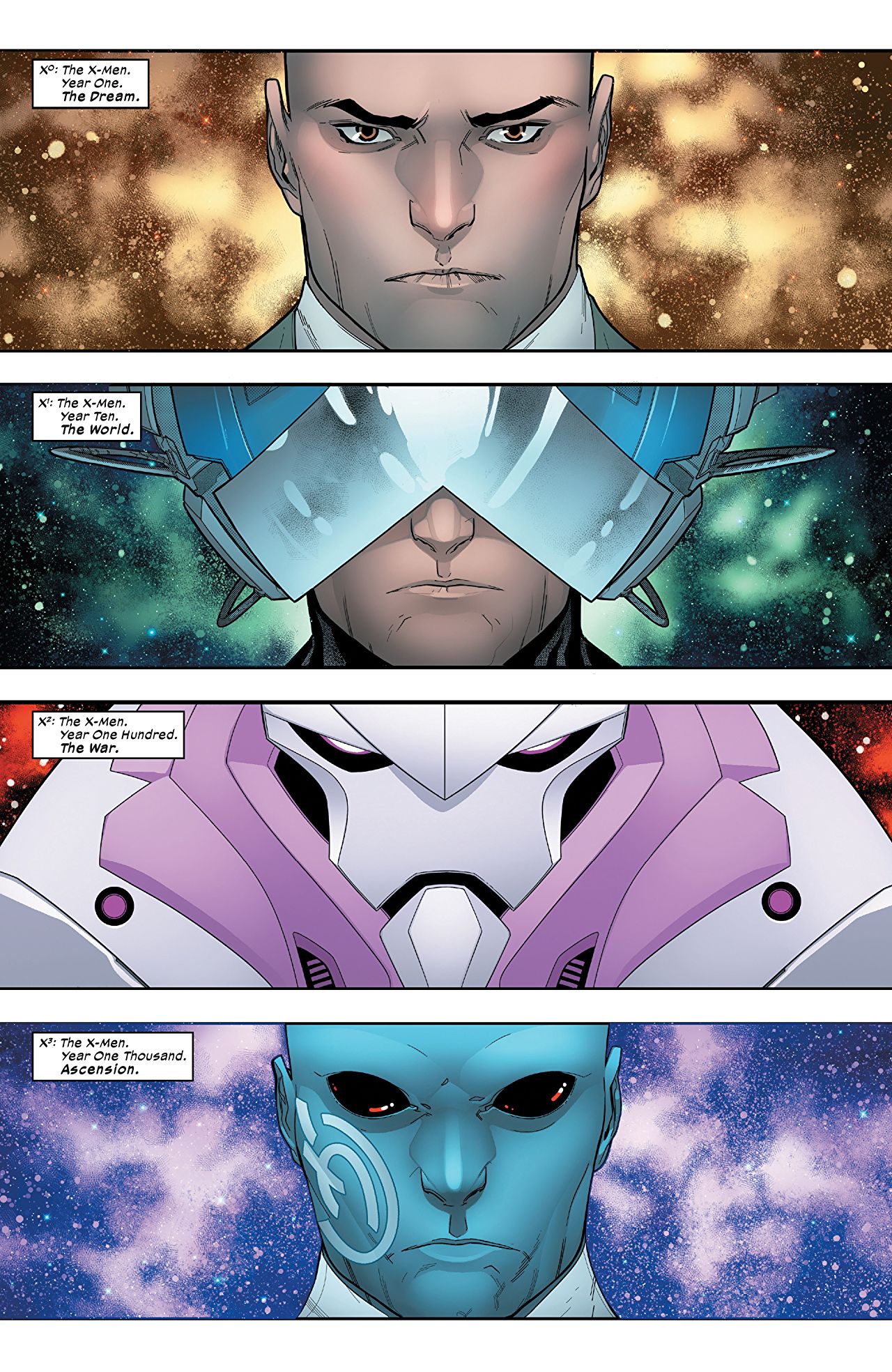 It explores events set in the past (designated Year One), the present, aka House of X (Year Ten), the future (Year One Hundred) and the distant future (Year One Thousand). This ambitious mode of storytelling allows series writer Jonathan Hickman to give readers a God’s-eye view of the events that will unfold throughout the story – assuming of course that our heroes don’t end up needing to prevent one of these events from happening. Unlike House of X, Powers of X has vision, which is a key ingredient if your plan is to reshape the X-Men universe going forward.