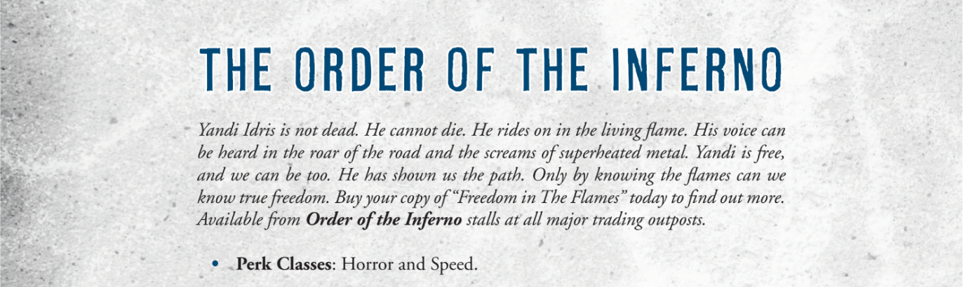 The separation of basic and advanced vehicles/weapons is great, as it simplifies and streamlines the games. This adds, tweaks, pokes and prods the rules from both Gaslands and TX, along with a couple new additions (a variety of exciting new dropped weapons and WALL OF AMPS!!!) and some logical reorganisation (Mishkin Vehicle Upgrades are no longer in Perks, but in the Vehicle Upgrades section where they should be!). We also have rules for Ramps (huzzah !) and they’re clear, simple and obvious, just the way things should be.