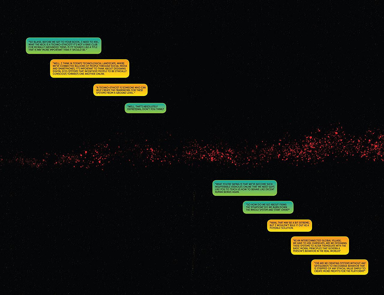 Objectively, the first dozen pages of this issue are far more tense than they have any right to be, with a simple black page, and an interview played out in text. A splash of red on the next page, growing and growing as each page turns becoming… something else.