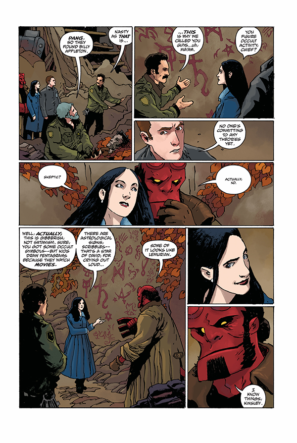 Set in the mid-1970s, Mike Mignola and Scott Allie are bringing us a thriller with a real X-Files-meets-Supernatural feel to it. There’s a lot going on in this issue, and a lot of people are introduced, all of whom seem wonderfully wholesome and above suspicion. There are theories galore, from witches to vampires, to demons and everything in between. Hellboy and Agent Kinsley take something of a back seat in this issue, letting local law enforcement offer most of the theories and details of the mystery. Where Hellboy and Kinsley are mostly involved is to provide a foil for the cops, providing little nudges and snippets of information but mostly sitting on the sidelines.
