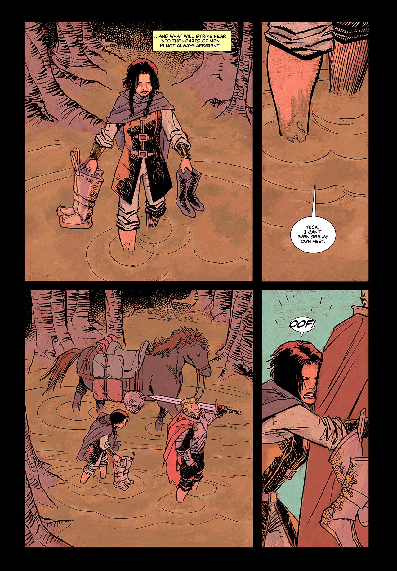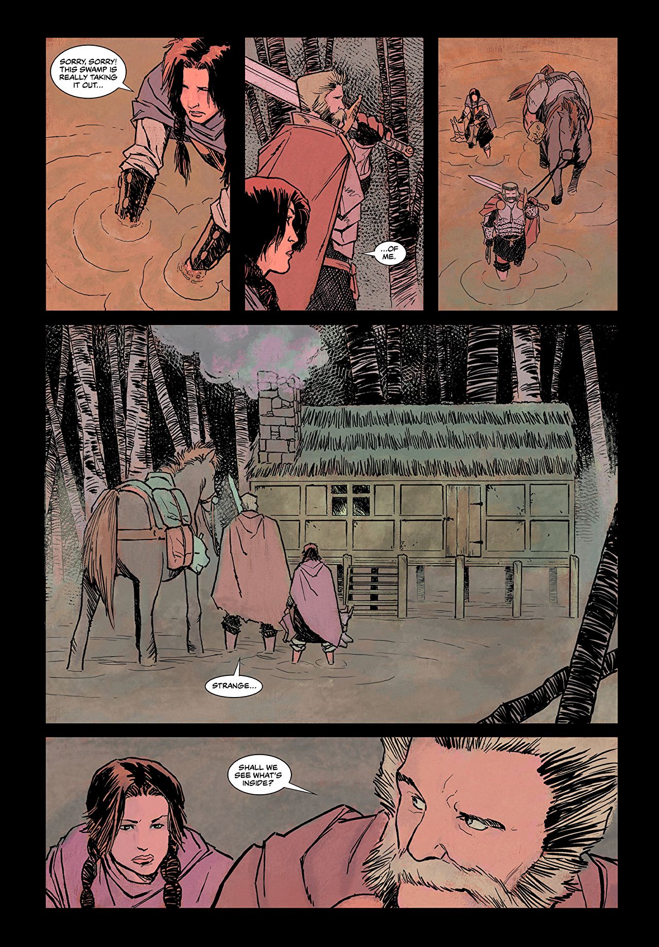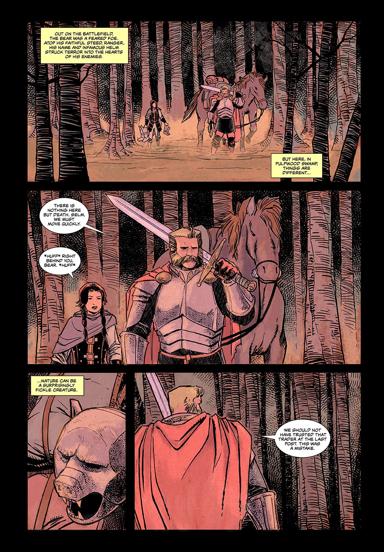 The opening pages of Caliber Comics’ Broken Bear feature a shocking betrayal as young squire Selm turns on her hulking mentor in a misguided attempt to regain the feeling of control and strength that was taken away from her when her entire village was murdered. The Witch she and her protector have encountered in the murk of Pulpwood Swamp is clearly tricking her to some extent, but there’s also a worrying amount of free will involved.