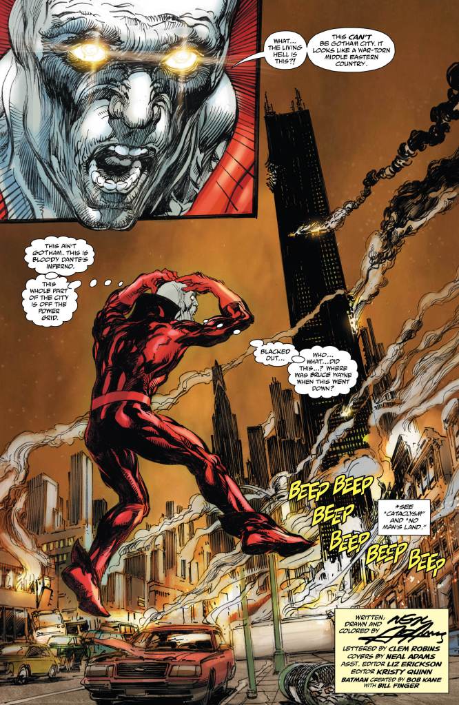 Unfortunately, the second thing that became apparent is the fact that Adams is a far stronger artist than he is a writer. Don’t get me wrong, the plot is serviceable enough, and features Batman getting physical with the criminal gangs who have sprung up in the wake of “No Man’s Land”, before crossing paths with Ra’s al Ghul and his mercenaries who are apparently assisting the G.C.P.D. with their clean-up operations. It’s just that the dialogue and narration, unlike the artwork, feels incredibly dated, and doesn’t flow anywhere near as smoothly as it needs to. Hey, I’m all for some nostalgic hokeyness, and having Batman using phrases like “what in the Sam Hill is that?” helps to cement the time period where the book is supposedly set, but there are several conversations here that feel forced, awkward and downright confusing, which derails a lot of the momentum that Adams has built up with his artwork.