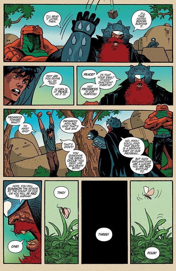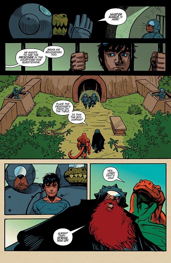 Last issue we were left with Armano sitting in a cell, a prisoner of the cruel and selfish citizens of the walled city of Azimuth. This issue opens ominously with Armano being brought in chains before General Magus and his reptilian assassin Amphax, and only Gogor can save him now. Upon their escape, Armano and Gogor show us some of the other islands of Altara, and the devastation that the Domus have brought to the people and the ecosystems of these incredible, beautiful islands.