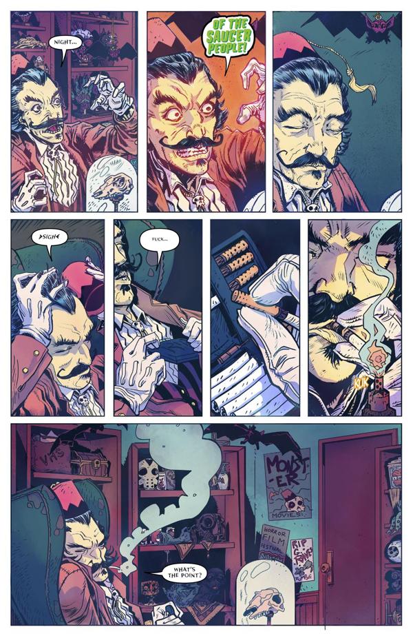 Character-wise, there’s the typical small-town horror movie cast. We have a L.A. “Alpha-Male” jock and his cronies who you’ll be praying to get eaten (or at the very least probed) within the first couple of panels of meeting them. There’s a group of bratty kids who – well – who you’ll also be praying get eaten within the first couple of panels of meeting them. There’s a TV host who’s very much a faded, drunken, Vincent Price. We’ve also have reasonably wholesome high school kid Jared, who’s desperately trying to hook up with a mysterious girl he talks to over the C.B. Channel. I’m laying good money on Tom Atkins turning up sometime very soon, at least I’ll be really disappointed if he doesn’t.