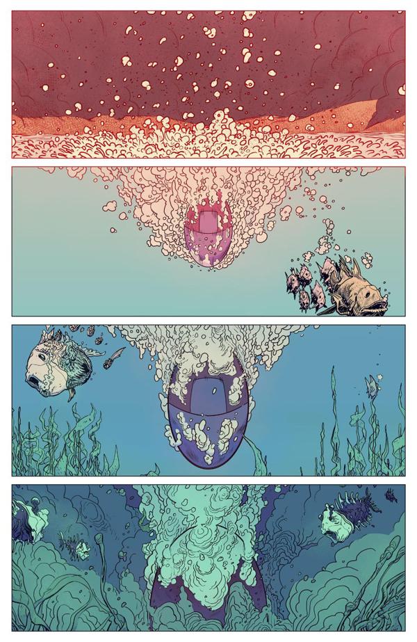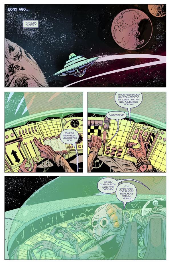 I love the artwork, for me a wonderful mixture of original EC, Mike Mignola circa Plague of Frogs, and a contemporary edge. The creature design is fantastic, and the horrific transformation the victim undergoes once they get one of the aforementioned brain slugs inside them was completely unexpected and particularly cool! I can’t fault the artwork or the colouring at all, it’s perfect for the type of story we’re dealing with, and has lots of nostalgic nods to its reference material and a certain Lovecraftian, Colour Out Of Space, feel to our Alien interlopers.