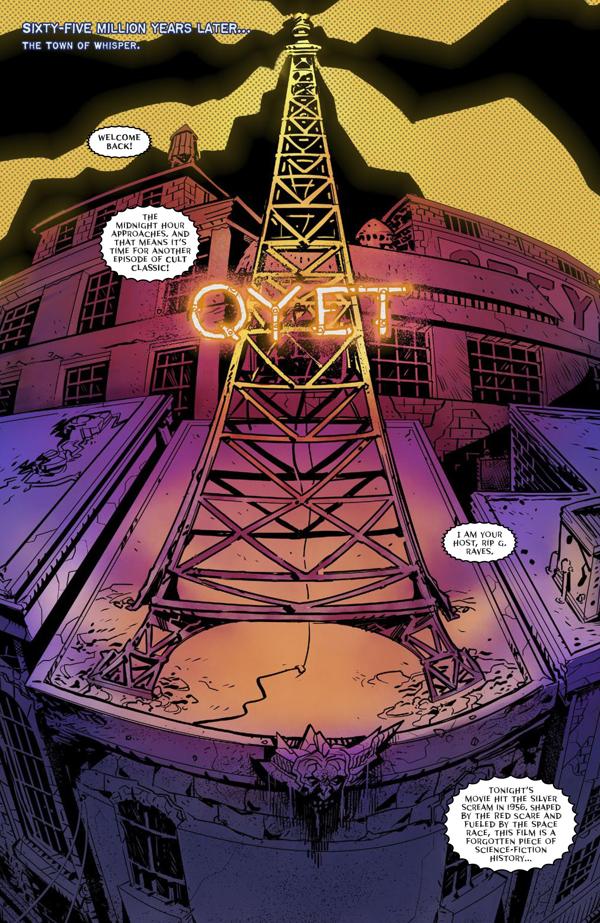 Character-wise, there’s the typical small-town horror movie cast. We have a L.A. “Alpha-Male” jock and his cronies who you’ll be praying to get eaten (or at the very least probed) within the first couple of panels of meeting them. There’s a group of bratty kids who – well – who you’ll also be praying get eaten within the first couple of panels of meeting them. There’s a TV host who’s very much a faded, drunken, Vincent Price. We’ve also have reasonably wholesome high school kid Jared, who’s desperately trying to hook up with a mysterious girl he talks to over the C.B. Channel. I’m laying good money on Tom Atkins turning up sometime very soon, at least I’ll be really disappointed if he doesn’t.