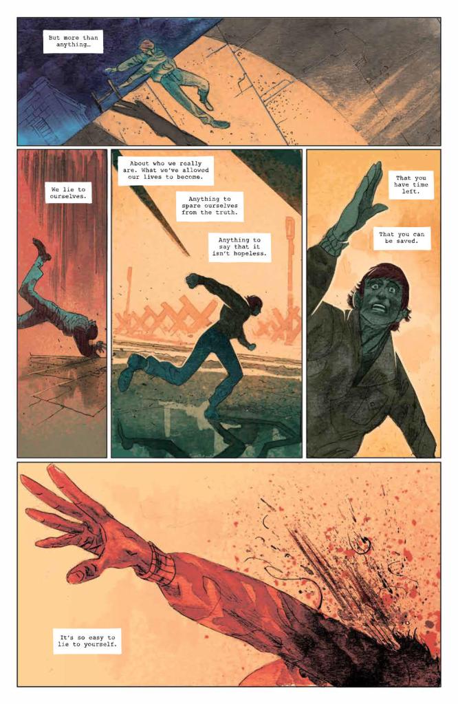 The characterisations, on the other hand, aren’t simple, but they did initially feel a little out of place. It’s almost as if they were too warming or disarming given what I felt the tone was trying to achieve. I think this also stood out more in the early panels given how striking and effective everything else was. That being said, the close-ups and cutaways, not to mention the climax of this issue, are wholly redeeming of any quibbles on my part.