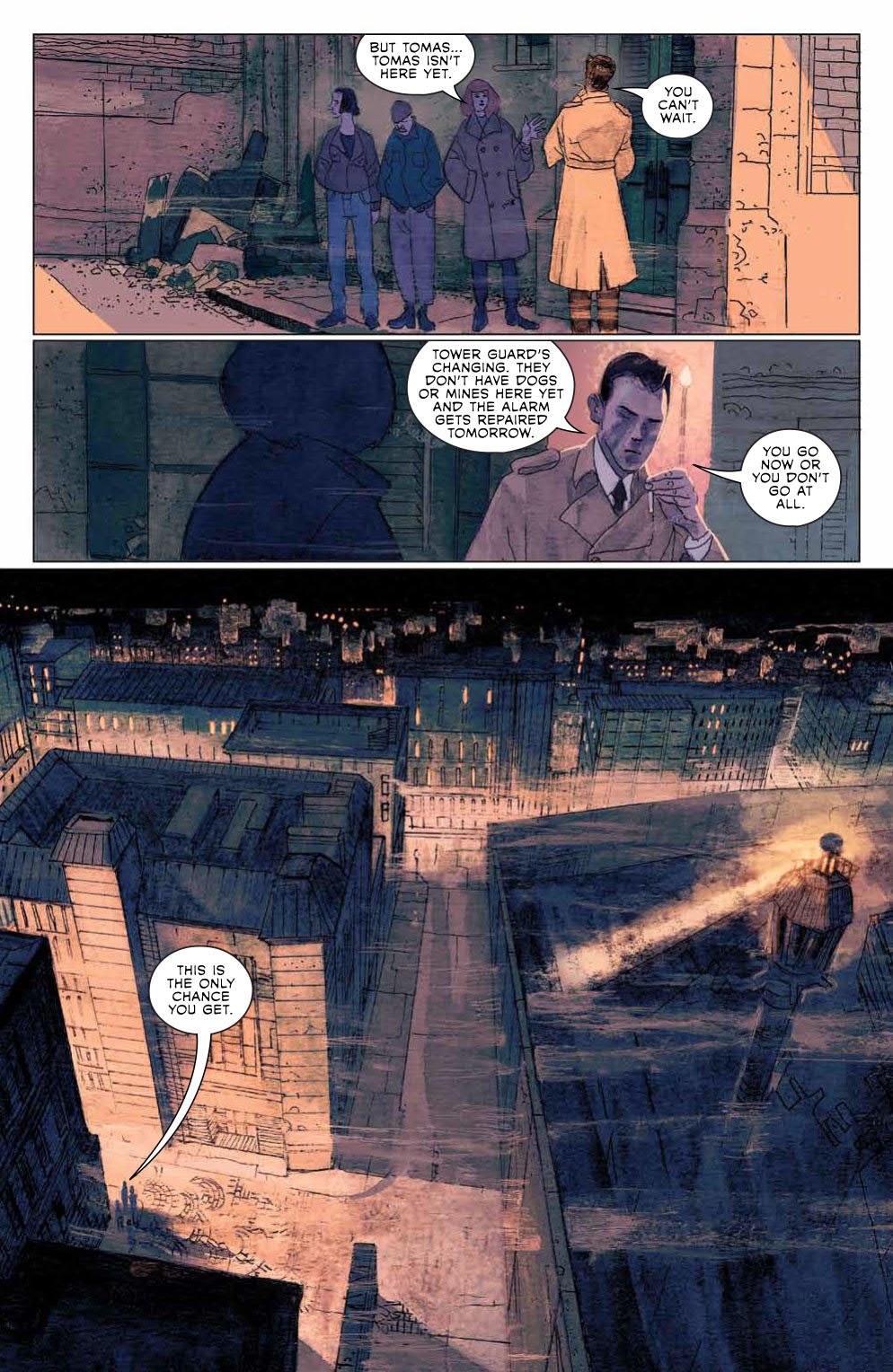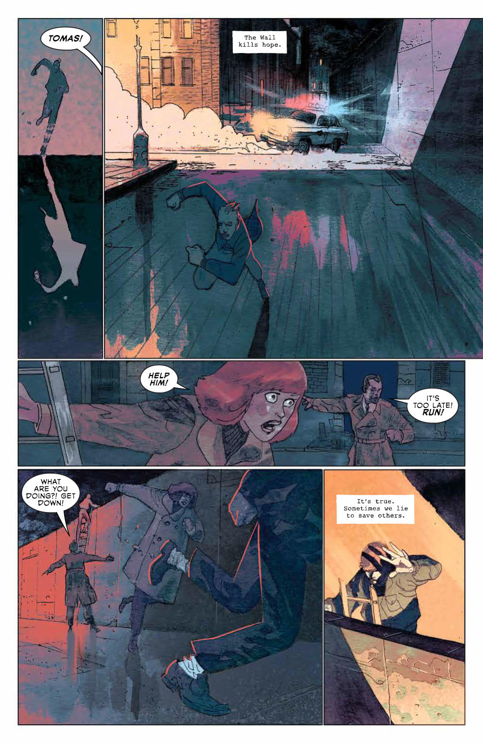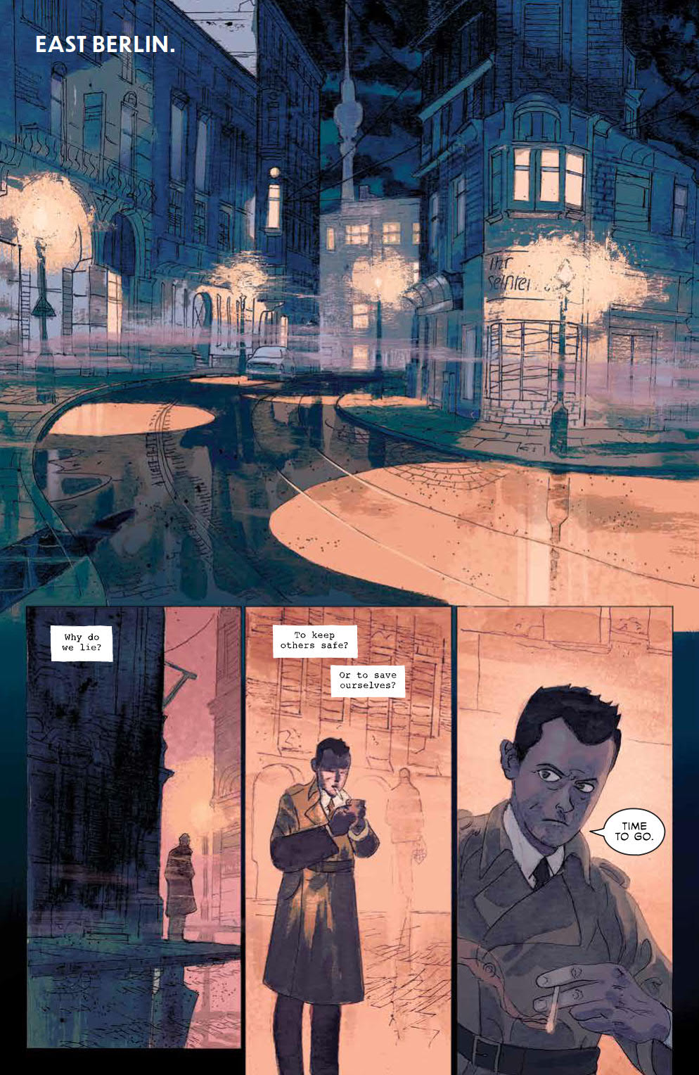 Visually, there is a lot to impress but I must be honest that it took me while to warm to the overall style. The opening panels of East Berlin and subsequent cityscapes are fantastic. The colouring ramps up the evocative nature of secret liaisons whilst trying to evade the glare of streetlight or Stasi lamps. I’ve never been to Berlin, but it definitely captures what I ‘feel’ it would have looked like.