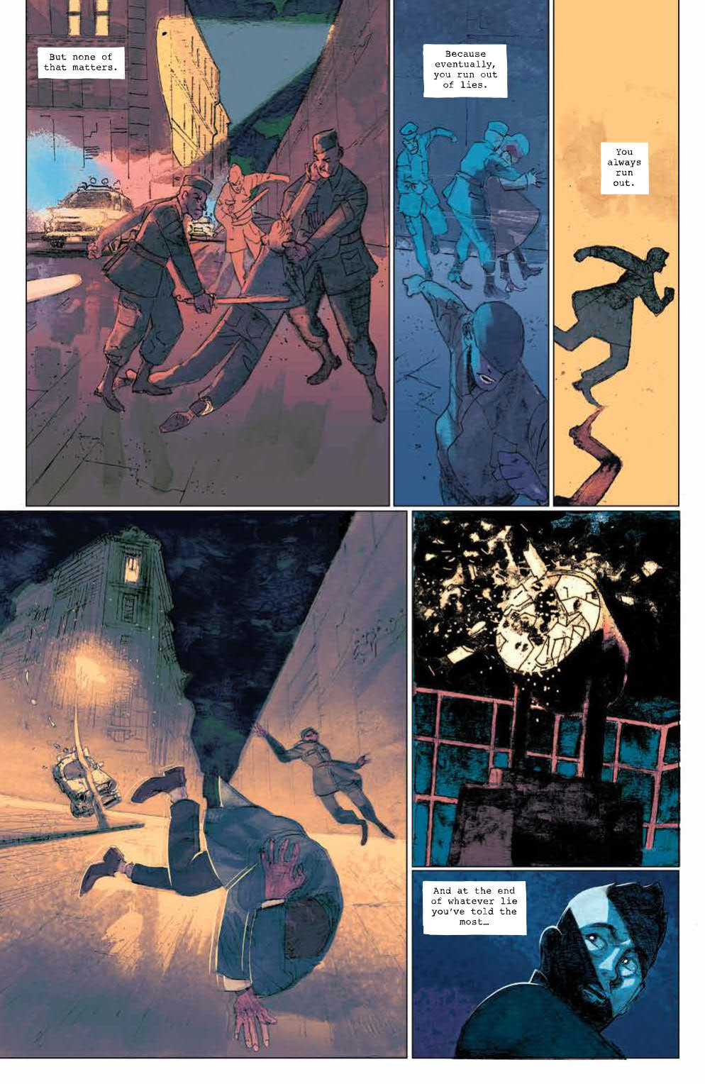 The pacing is excellent and pulls you into the web of intelligence and counter-intelligence with ease. The use of typewriter lettering for the monologing is a great touch which really help here to create a steady rhythm whilst fostering a connection with the plot. One is drawn to feel concern for the protagonist but there’s not much there to like. Cleverly playing on established tropes it’s easy to fall into the trap of pegging sides as the ‘goodies’ or ‘baddies’ but this could very easily be up-ended before we reach the conclusion.