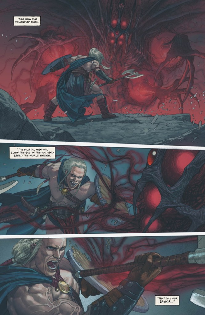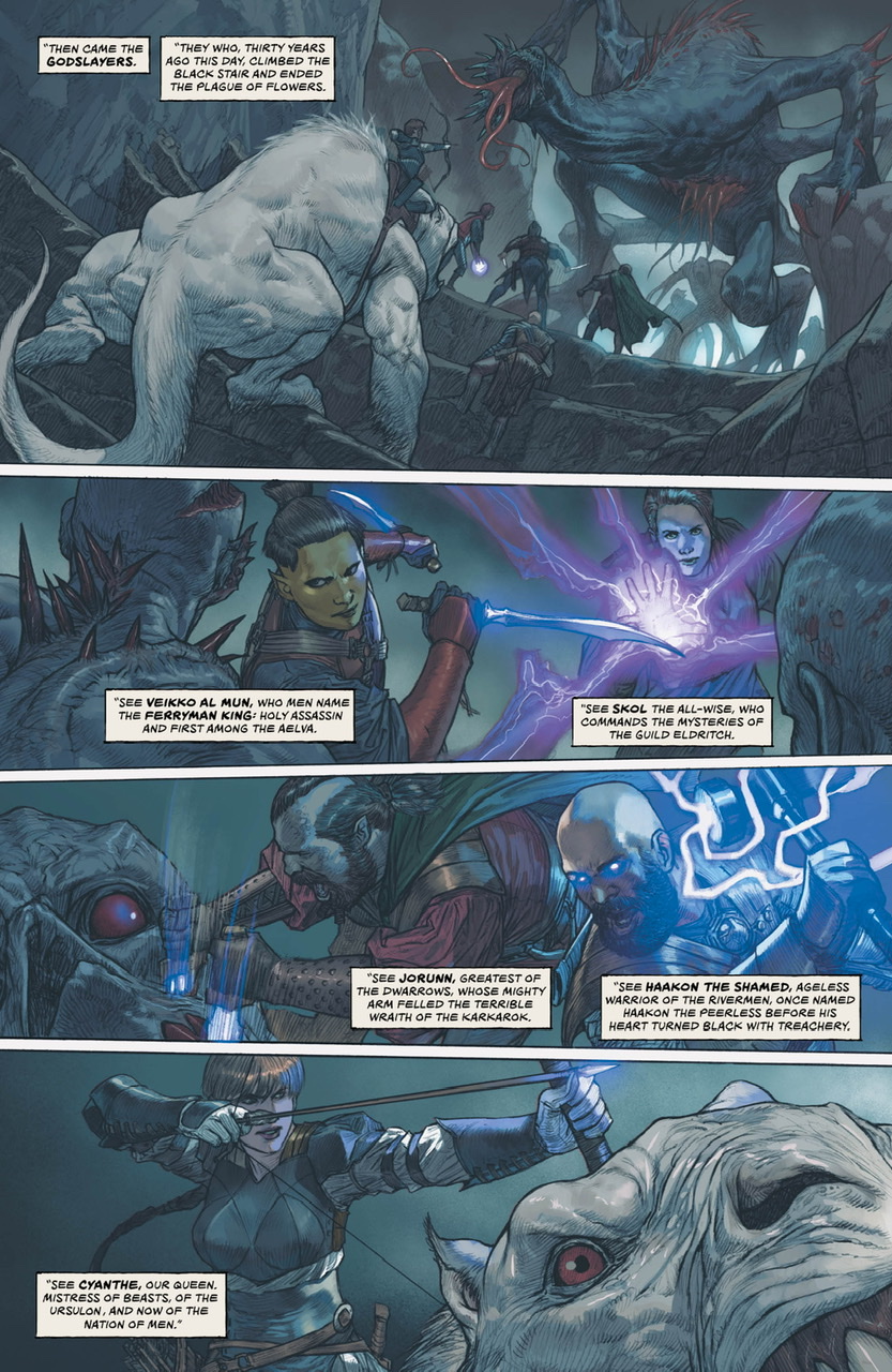 As I said, the artwork does a lot of the heavy lifting here, but while I absolutely love the feel of digging into a new fantasy world with its heroes, legends and dark prophecies, I also need some sort of investment in the characters themselves. And that, for me, is where this issue falls down a little. As far as I can see, none of the characters introduced here have anything remotely unique to make them stand out from the pack. Everyone is someone we’ve seen dozens of times before, from plucky gladiator slaves to gruff, belligerent Kings to outwardly regal Queens hiding their own secret machinations. This is fantasy-by-numbers, and while it’s an enjoyable enough read, I was really expecting a lot more from the creative team assembled here.