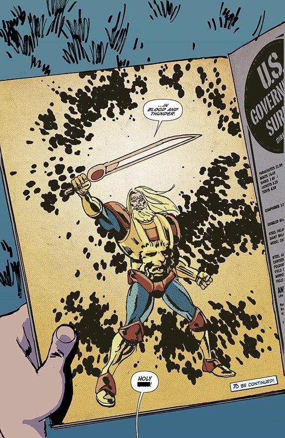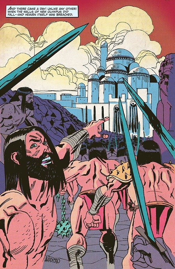 This is quite an intriguing first issue, a story breaking the fourth wall within itself, and somewhat reminiscent of the early exploits of the MCU depiction of Thor’s arrival on Earth. Elon is quite a tragic kid who garners sympathy and concern early on. After the death of his father, Elon’s mum is doing her best, but works all hours to provide for them, leaving Elon to fend for himself in a world he’s not socially equipped to deal with. At school he’s a outcast and a misfit, and seems to have no friends he can turn to, hence his escape into the world of comics. The Olympian however, is not a particularly sympathetic character, and whilst his initial introduction is that of the likeable, bombastic, hale-and-hearty Asgardian style of God, there is a colder side to him that shows little of the humanity of the former.
