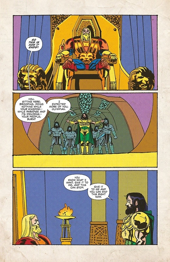 The artwork in this book is a bit hit and miss but overall works in conveying the world that Curt and Tony Pires are building for us. The definite style change between the comic world and the *real* world works really well, managing to make the comic world of the Olympians look more like a comic than the comic you’re reading. Now, while I’m not a huge fan of the artwork in this issue – it’s just a bit too rough in places for me – it does a nice job of conveying the emotions of the characters and setting the tone of Pires’ story. What lifts the artwork for me is Dee Cunniffe’s colouring, which always brings something extra to a comic and, where I’d normally expect it to complement the artwork, in this case I think it covers some of the rough edges and helps you to really get into the story
