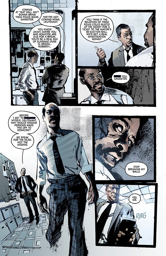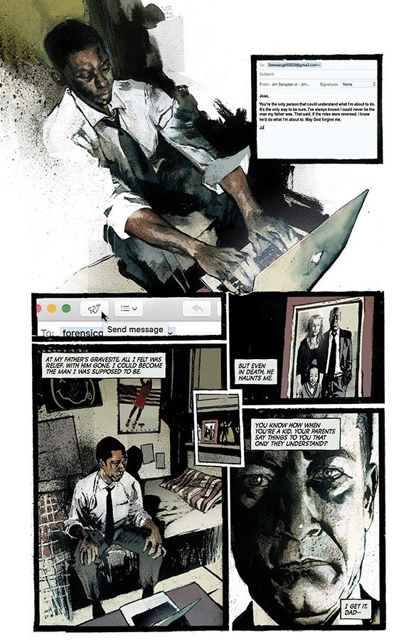 The first issue runs two timelines together; the story of James Sangster Senior doggedly searching for answers to a string of missing people and the story of his son, burying the man that he has hated for most of his life, and discovering that his death was far from a simple case of murder. Both threads of the story intertwine throughout the issue, but the narrative flow never becomes confusing. I do think that the lettering on this issue really helped in terms of making it easy to work out who was speaking, and the switch between Sangster senior and Sangster junior.