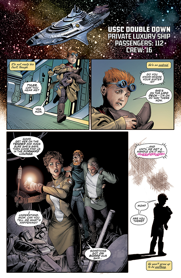 It’s not going to be an Alien story without an android, and rather than try to build up to a shock reveal, it’s made clear from the start that ours comes in the form of one of the central characters. Rather than an apparently super helpful psychotic Englishman, here it’s a youngster acting as child and younger brother within a family unit. Now childlike androids or AI aren’t exactly a novel idea, but within the AvP world this is an opportunity to explore some interesting themes. The title suggests familial bonds will definitely be under the spotlight during this mini-series; just maybe not in the way we expect.