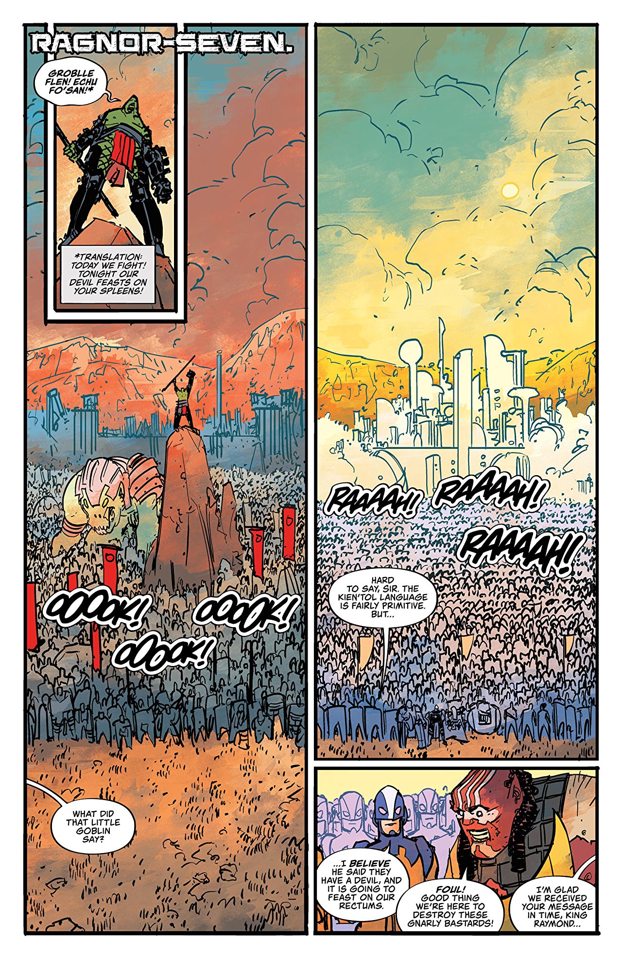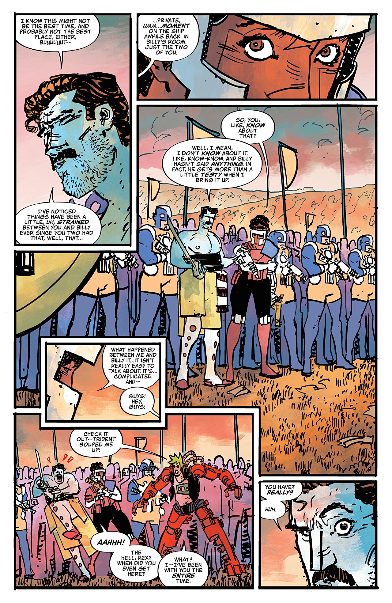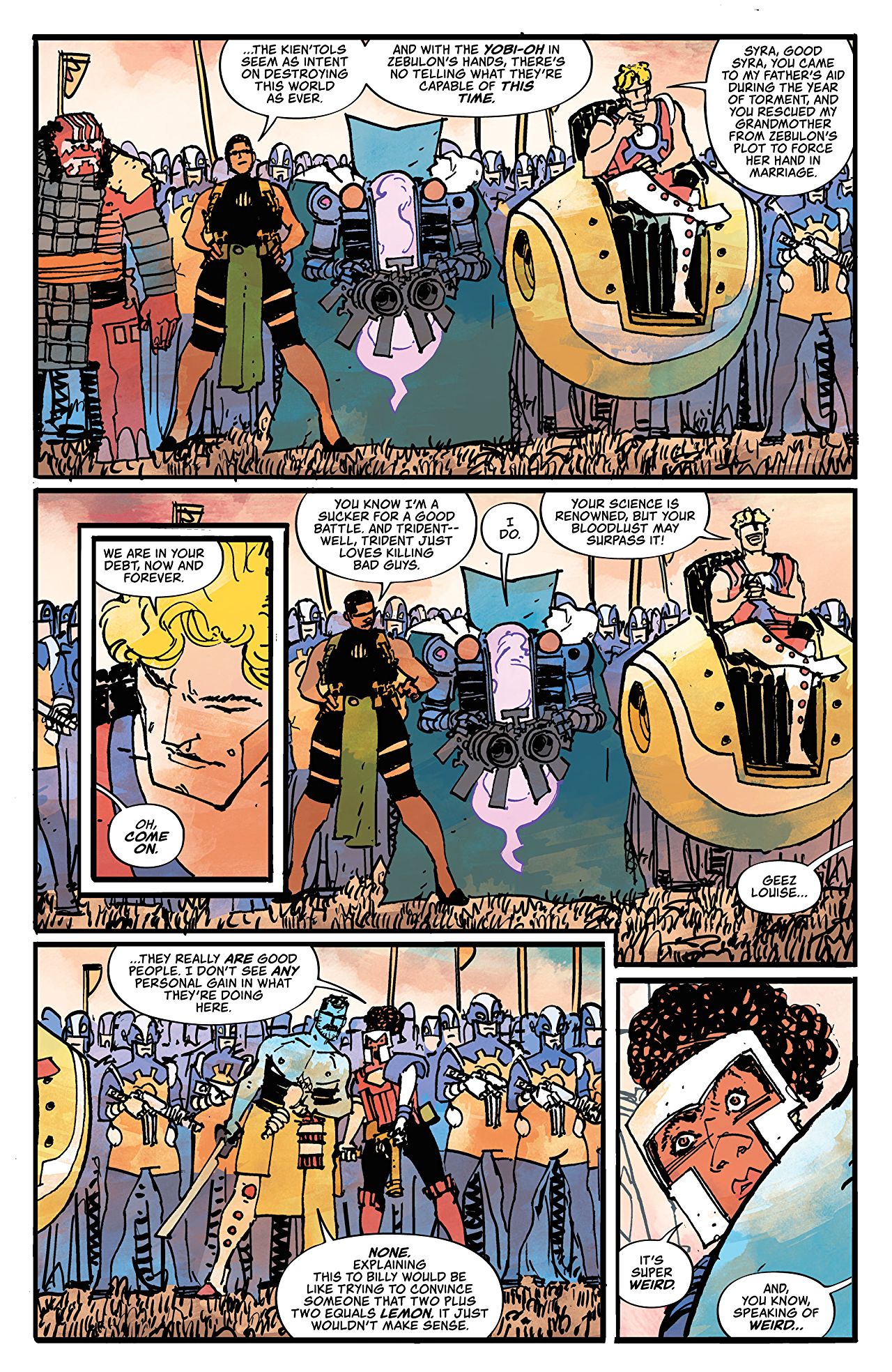 Elsewhere, Molly and Dust (oh, and Rex too, apparently?) have found themselves inserted into an almost comically epic battle alongside the do-gooder strangers. The noble, altruistic motives of their newfound allies is clearly commendable, but I’m sure I’m not alone in spending the majority of these sequences side-eying the creative team and waiting for the (perhaps inevitable) punchline. That’s not to say these scenes aren’t thoroughly entertaining, but it’s perhaps a testament to the series so far that any seemingly pure or heroic motivations find themselves viewed with cynical suspicion by the reader.