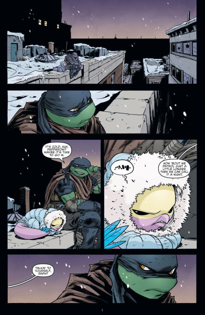 For me though, the real highlight of the issue is the scene featuring Mikey, Donnie and Leo. Each brother is clearly struggling to find direction following their father’s death, and each is handling their grief in their own way. This sequence also really helps to showcase Campbell’s light touch as a storyteller, and the mostly wordless panels do a better job of explaining each brother’s emotional mindset than any amount of dialogue or exposition ever could.