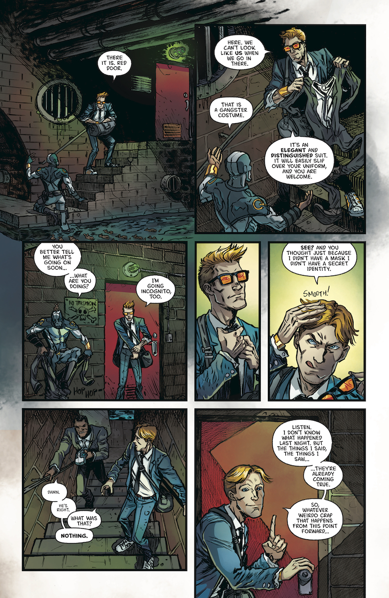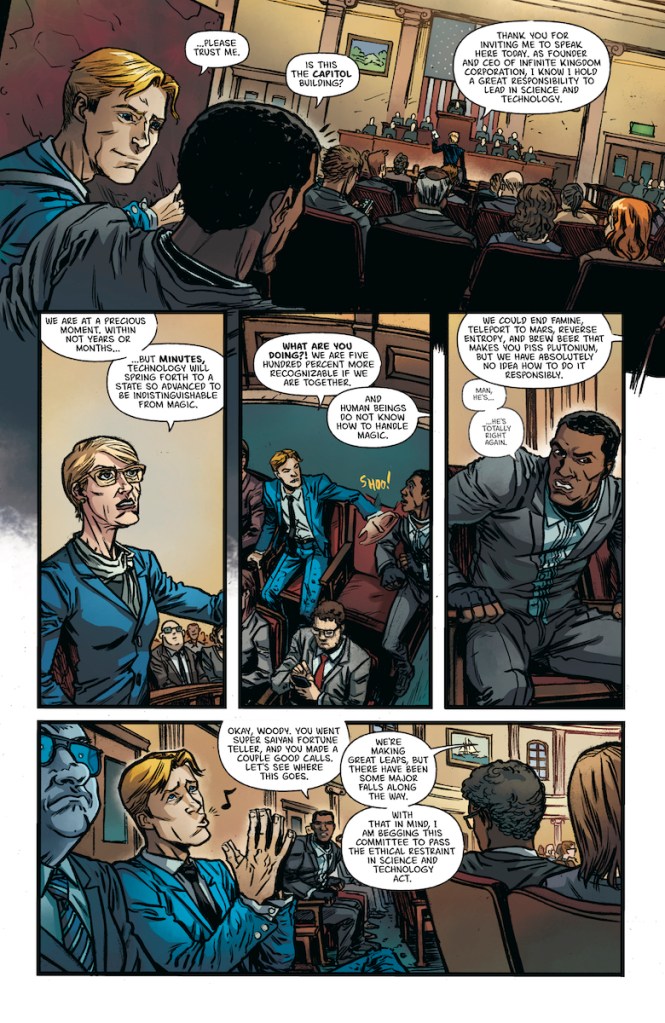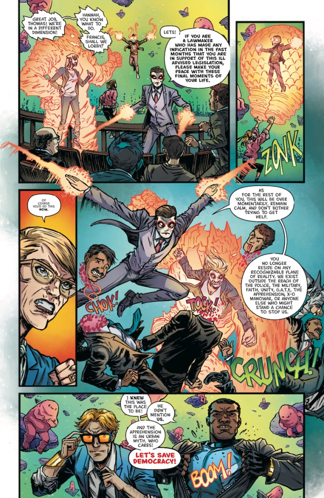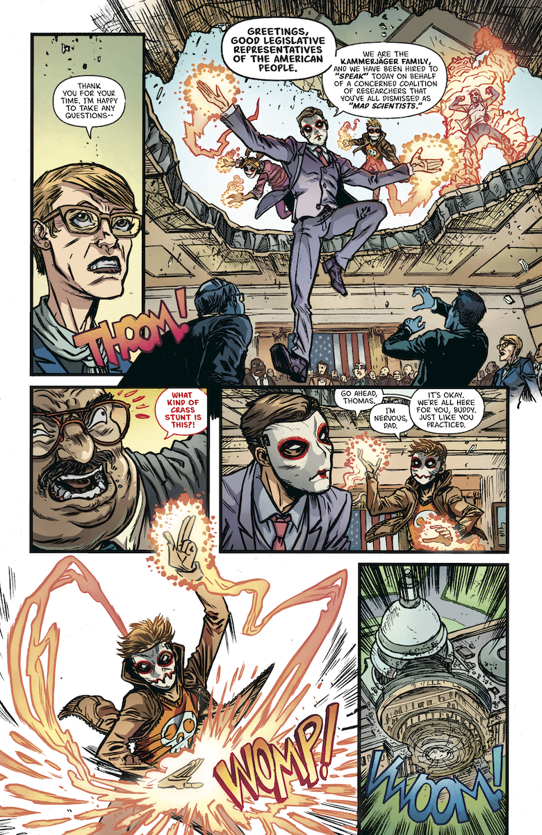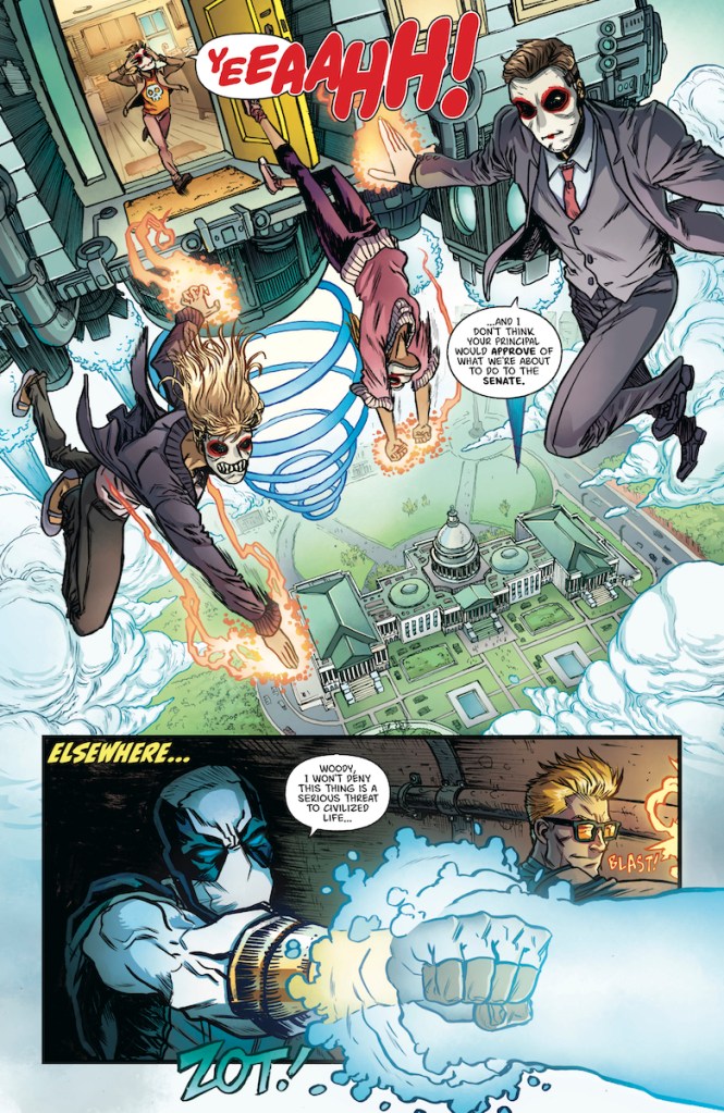 The issue hits the ground running as, out of nowhere, Woody starts inexplicably glowing (yes, glowing) and babbling what is initially thought to be a stream of nonsense, but could actually end up being a startlingly accurate premonition. Where are his words coming from? What do they mean? And who are the mask-wearing super-powered nuclear family hell-bent on destroying the Senate?