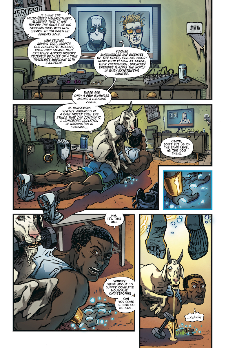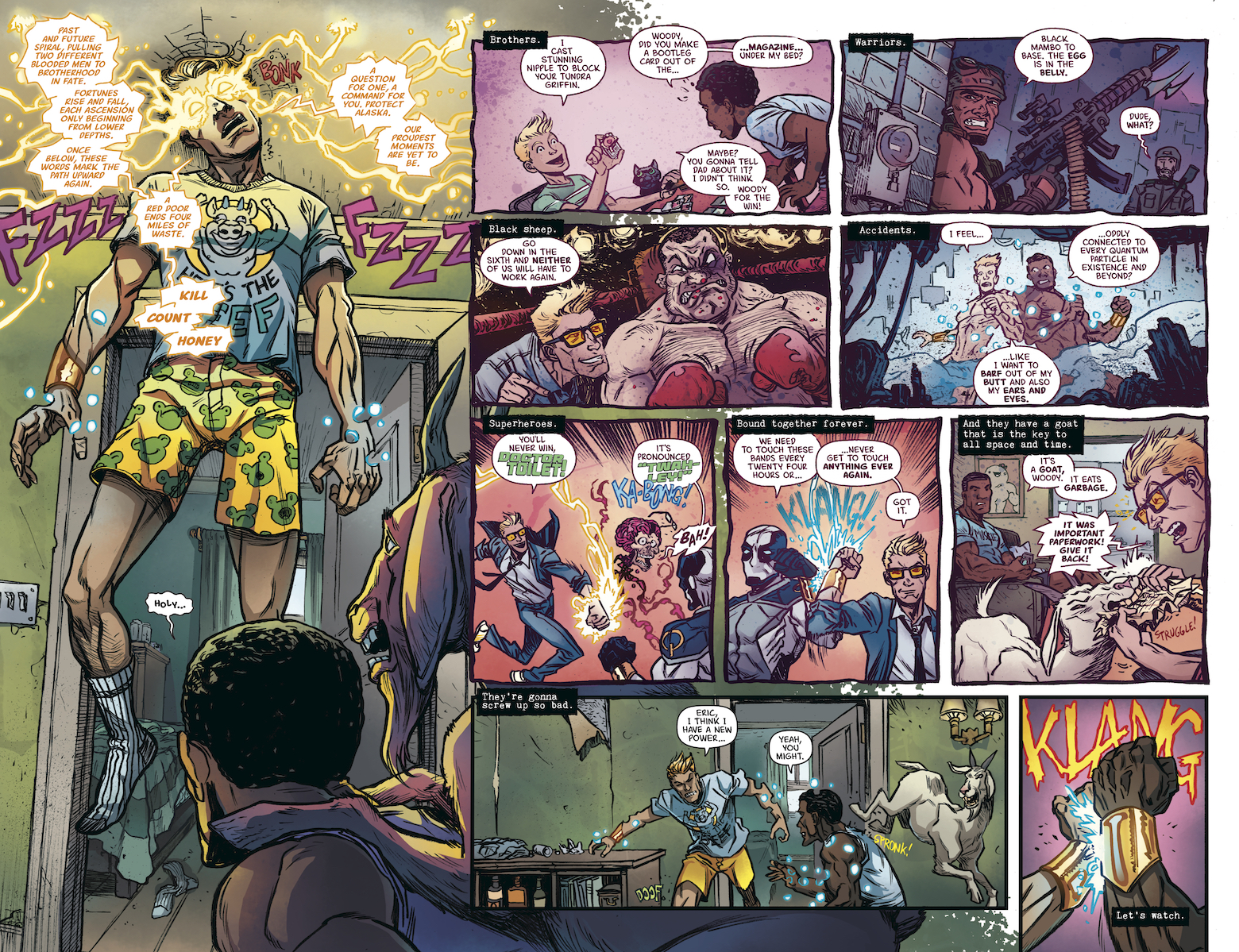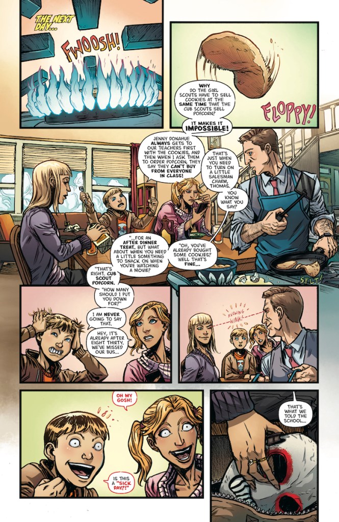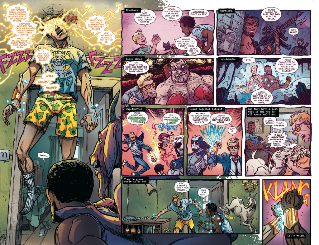 The issue hits the ground running as, out of nowhere, Woody starts inexplicably glowing (yes, glowing) and babbling what is initially thought to be a stream of nonsense, but could actually end up being a startlingly accurate premonition. Where are his words coming from? What do they mean? And who are the mask-wearing super-powered nuclear family hell-bent on destroying the Senate?