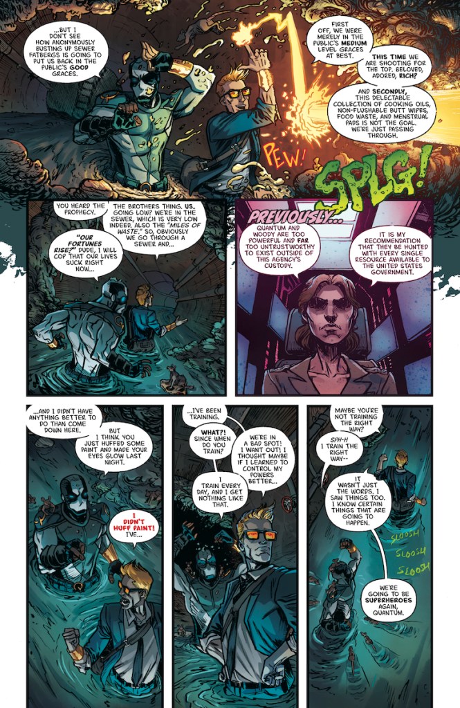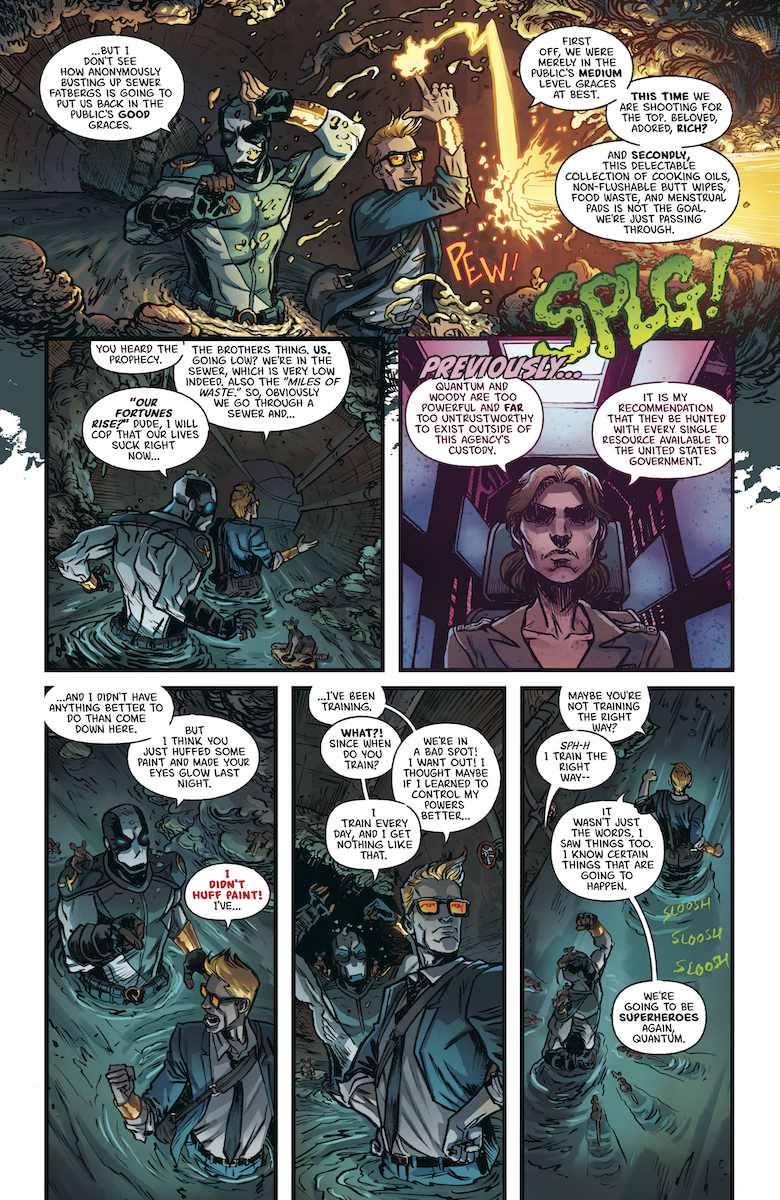 Don’t get me wrong, Quantum and Woody fans will find a ton to like here, with the loveable twosome up to their usual shenanigans and the whole wildcard/straight man dynamic firing on all cylinders. For me though, it’s just a little too much at times. Too crazy, too many gags, too much energy. I know, I know – this is a Quantum and Woody comic, so what could I realistically be expecting? But the genuinely interesting character moments, like Quantum’s suspicions of Woody’s true motivations, are all swept aside in a hail of energy blasts and explosions, which feels like a bit of a missed opportunity to me.