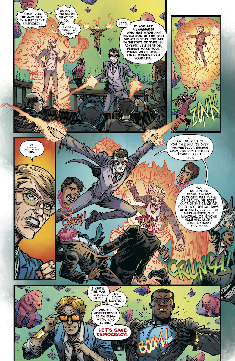 On the positive side of things, Ryan Browne’s artwork is always well worth a look, and he does a typically dynamic job here keeping the bonkers action (mostly) under control. With heads being removed, explosions rocking the Capitol Building and all manner of glowing super-powers competing for page space, this issue had the potential to turn into an over-stuffed mess, so it’s a testament to both Browne and the colours of Ruth Redmond that everything flows quite as well as it does. Sure, there are a few tough-to-follow moments along the way, but these seem almost by design than anything else, and the whole thing crackles with excess and energy from start to finish.