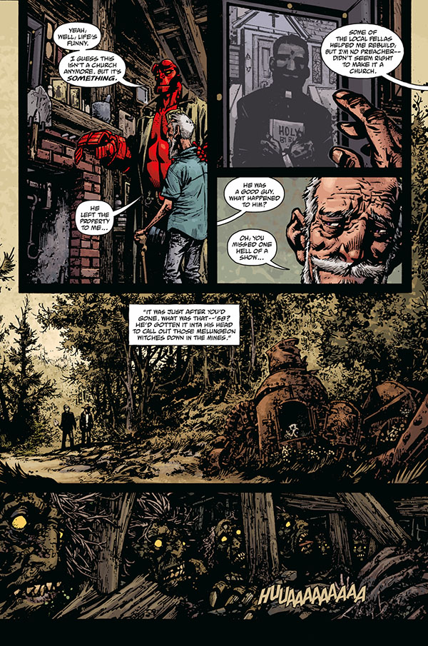1958. High in the Appalachian Mountains of Virginia, Hellboy sets out to help a village plagued by witchcraft and stumbles on a vast coven infesting the woods and mines of the surrounding woods. With the cursed wanderer Tom Ferrell at his side, they seek out a way of saving both the souls of Tom and a young witch, Cora Fisher, from the demonic gatherer of souls known as The Crooked Man and the evil witch Effie Kolb. With the assistance of Father Nathaniel Armstrong Watts, Hellboy banishes The Crooked Man, and Tom has his revenge on Effie, trapping her in the form of a horse.
