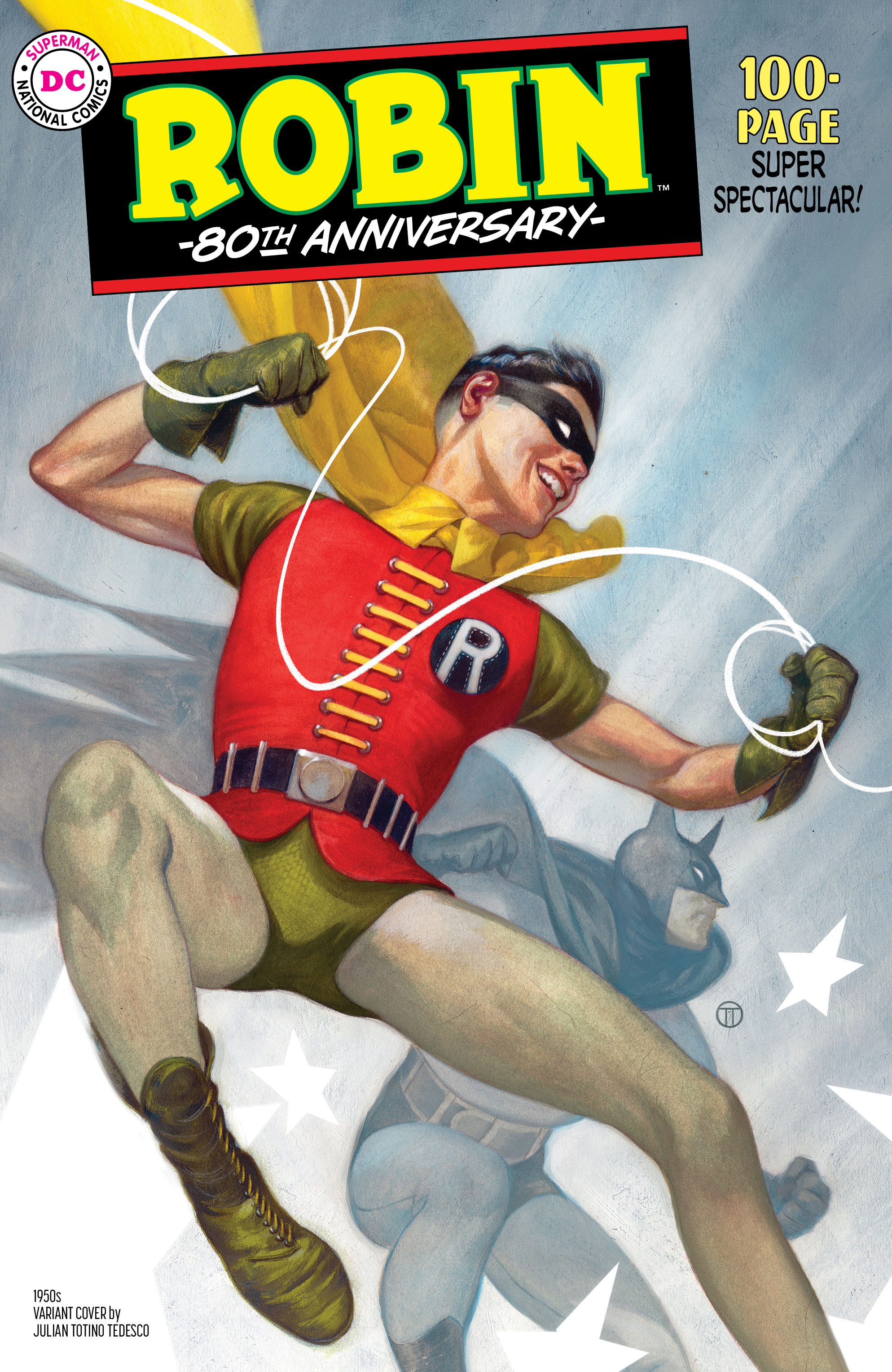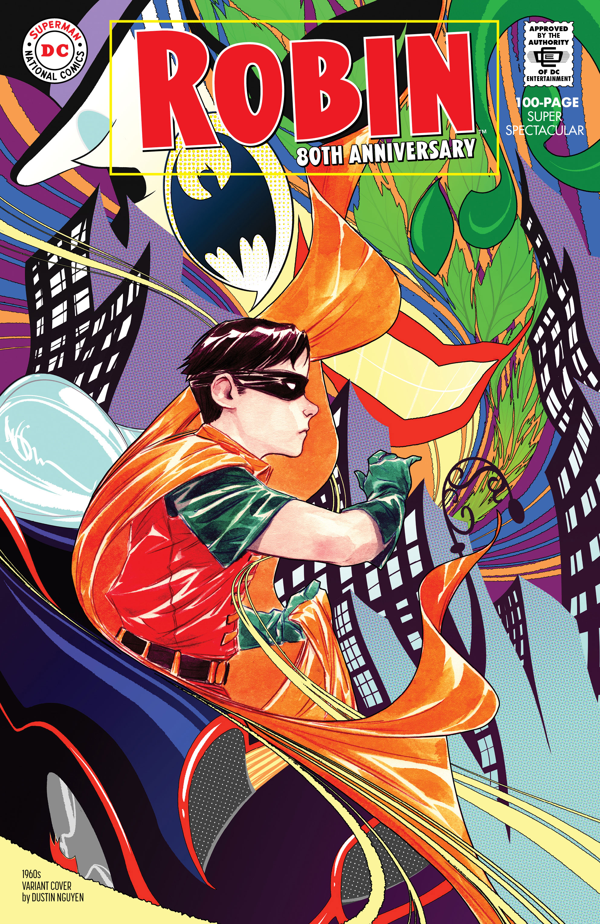 Robin 80th Anniversary 100-Page Super Spectacular #1, with a main cover by Lee Weeks, includes contributions by writers Marv Wolfman, Chuck Dixon, Devin Grayson, Tim Seeley, Tom King, Judd Winick, James Tynion IV, Amy Wolfram, Robbie Thompson, Adam Glass, and Peter J. Tomasi, and artists Tom Grummett, Scott McDaniel, Mikel Janin, Kenneth Rocafort, Freddie Williams II, Javi Fernandez, Nicola Scott, Dustin Nguyen, Andy Kubert, and Frank Miller.